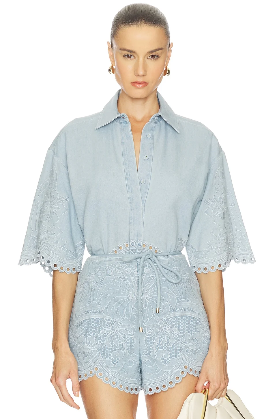 - Self: 100% cotton Embroidery: 100% polyester - Made in China - Machine wash cold - Front button closure - Embroidered denim fabric - Item not sold as a set - Revolve Style No. ZIMM-WS264 - Manufacturer Style No. 7214TRS263
