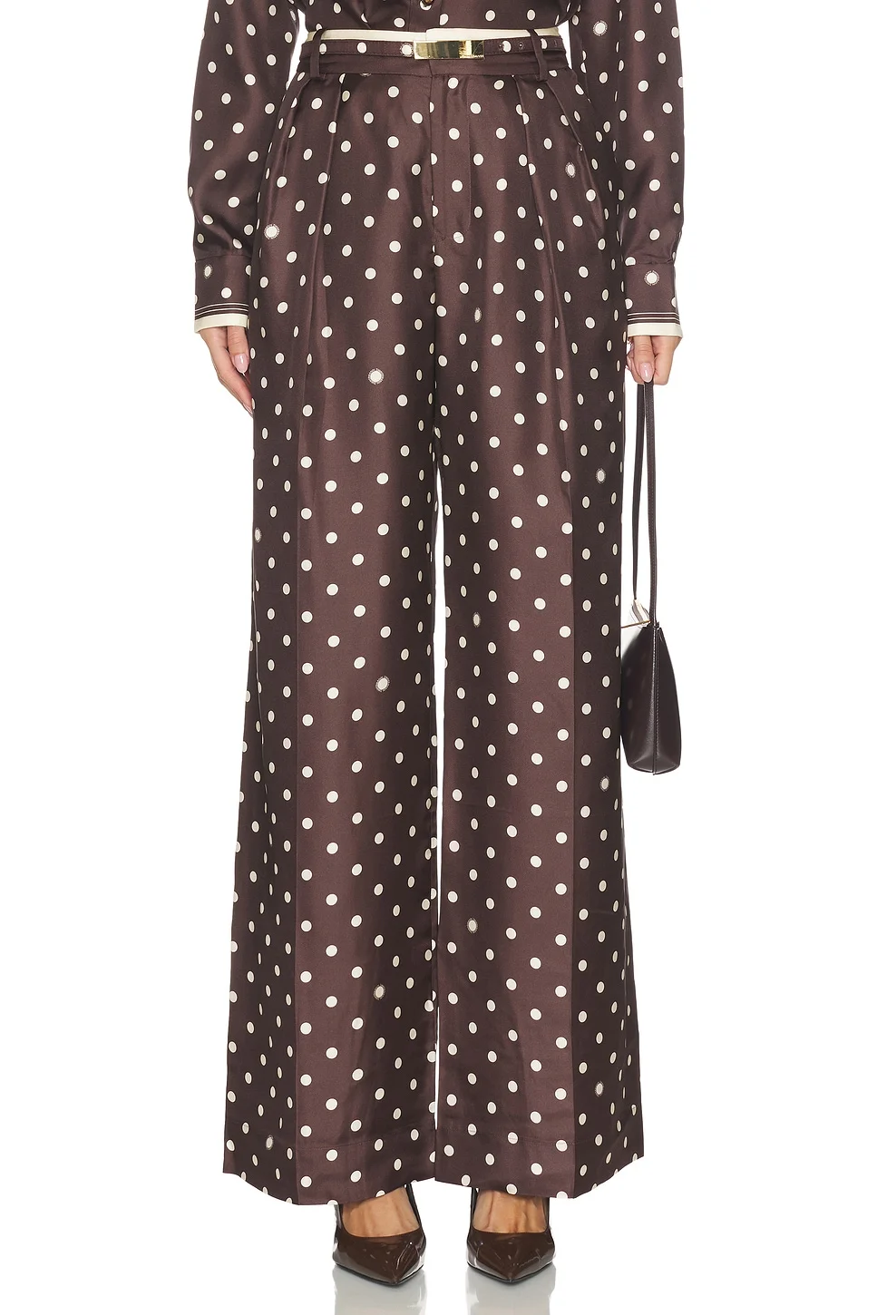 - 100% silk - Made in China - Dry clean only - Zip fly with button and hook closure - Detachable belt - Lightweight sateen fabric - Side seam pockets.24" at the leg opening - Revolve Style No. ZIMM-WP57 - Manufacturer Style No. 8883PS26R
