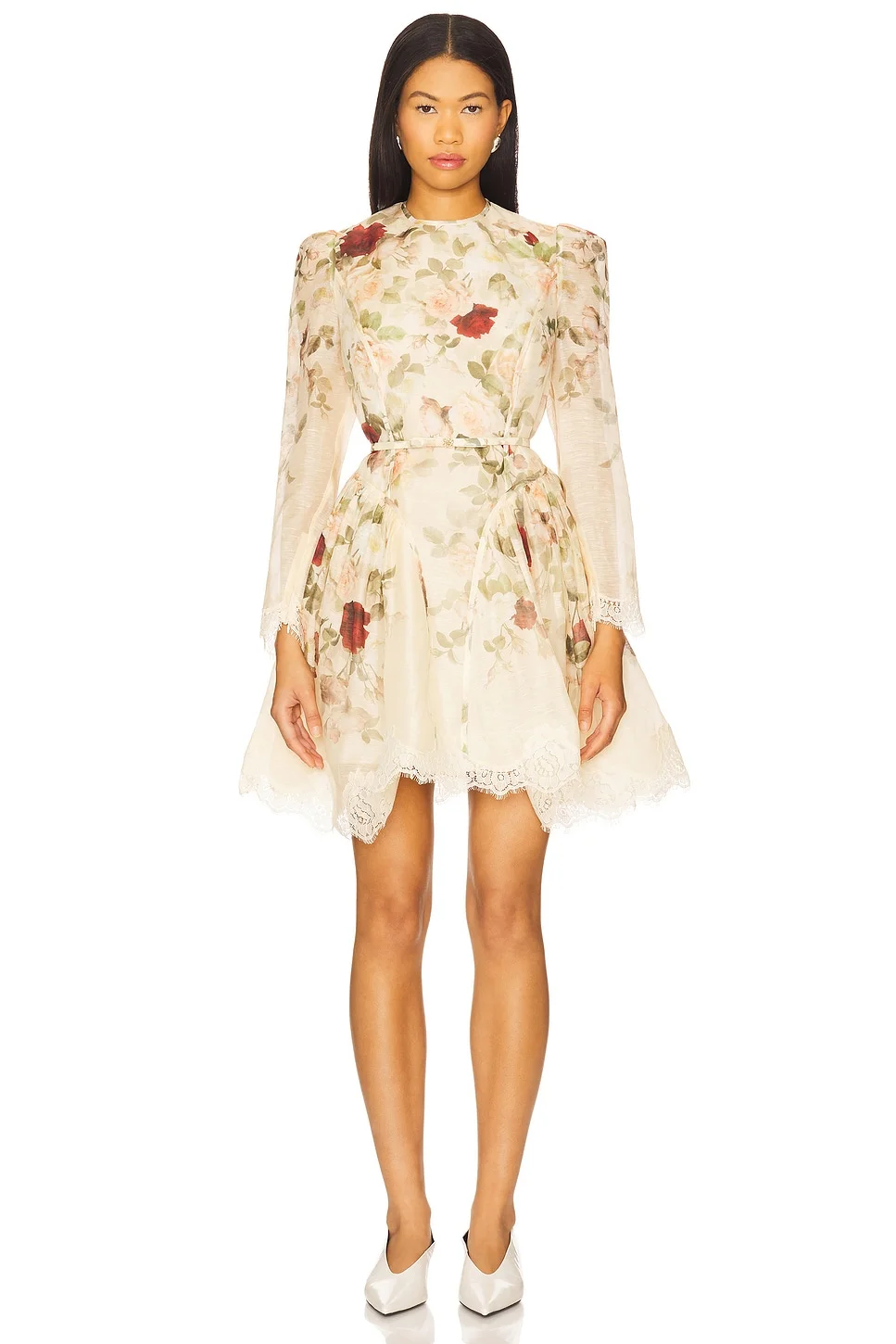 - Self: 53% linen 47% silk Lining: 100% cotton Contrast Fabric: 100% polyester - Dry clean only - Fully lined - Hidden back zip closure - Detachable belt with front bow accent - Puff sleeves with lace cuffs - Midweight linen fabric - Revolve Style No. ZIMM-WD617 - Manufacturer Style No. 5241DF251