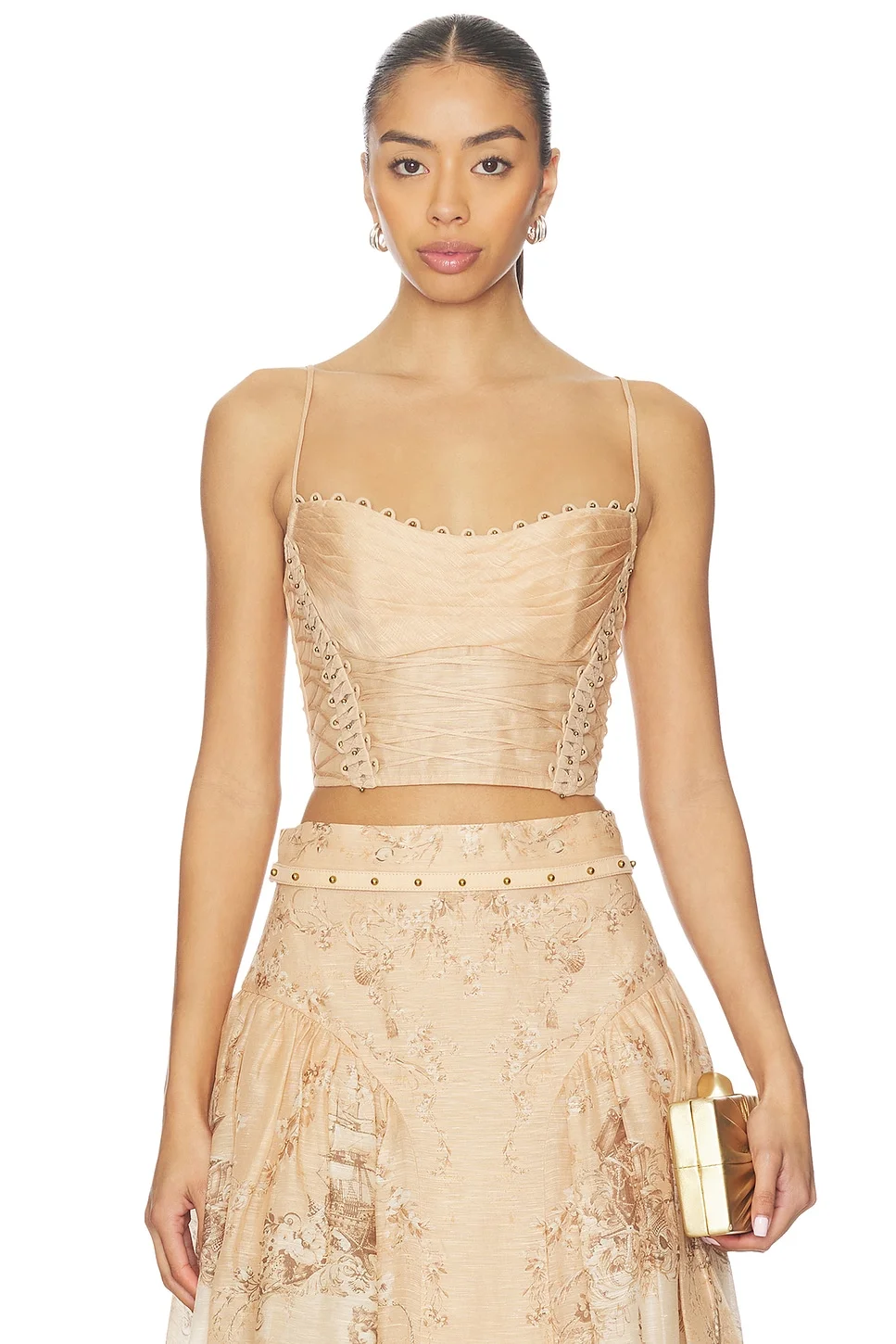 - 55% linen 45% silk - Made in China - Dry clean - Ruching at bust - Crepe fabric - Lace ties across front and side panels - Beaded trim - Shirred back with zip closure - Revolve Style No. ZIMM-WS262 - Manufacturer Style No. 6927TC261