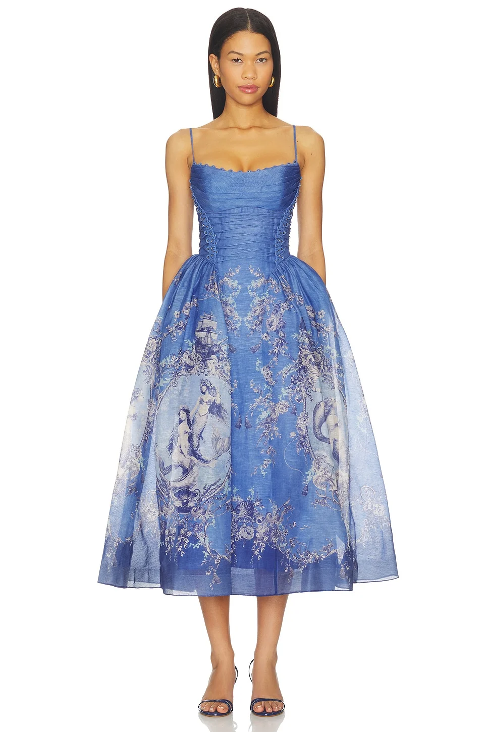 - Self: 55% linen 45% silk Lining: 100% cotton Contrast Fabric: 100% polyester - Dry clean only - Fully lined - Hidden back zip closure - Adjustable shoulder straps - Lace-up detailing at bodice - Heavyweight linen fabric - Revolve Style No. ZIMM-WD638 - Manufacturer Style No. 6347DC261