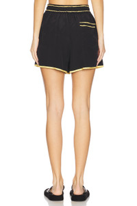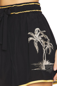 - 55% viscose 45% silk - Made in China - Dry clean only - Drawstring tie closure at waistband - Lightweight crepe fabric with graphic detail at front - Single back patch pocket - Side seam pockets - Shorts measure approx 14" in length - Revolve Style No. ZIMM-WF82 - Manufacturer Style No. 4115AS25R