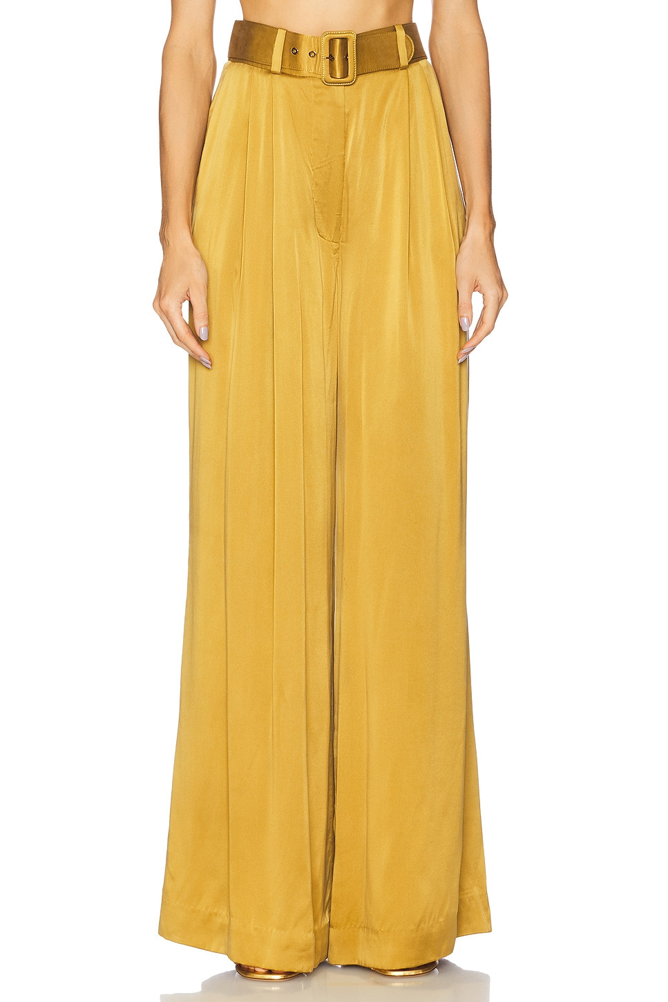 - Satin textile - Imported - Dry clean recommended - Zip fly with double hook and bar closure - Detachable belt with buckle closure - Midweight satin fabric - Item not sold as a set.26" at the knee breaks to 30" at the leg opening - Revolve Style No. ZIMM-WP49 - Manufacturer Style No. 2151PF25R