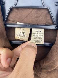 PLEASE CONTACT TO ME WITH ANY QUESTION BEFORE BUYING.. PLEASE READ THE DESCRIPTION AND POLICIES BEFORE BUYING. TAG BRAND :- Armani Exchange SIZE ON TAG : Medium ACTUAL SIZE MEASUREMENT :- ARM PIT TO ARM PIT :-21.5”incher BACK COLLAR TO HEM:-26.5”incher PLEASE COMPARE THE MEASUREMENT WITH YOUR GARMENT CONDITION :-8/10(Refer Pictures) COLOUR :-Brown View Pic.. MATERIAL : Refer pic Kindly read my shipping and policies. SHIP WORLDWIDE VIA DHL GLOBAL MAIL. ⚫️Takes 14 working days to arrive. ⚫️Safely trackin number=You can track n trace until it arrive! PAYMENT ⚫️Accept paypal only ⚫️Item will be ship in 1-3 days after payment cleared. THANKS FOR WATCHING MY ITEM! PLEASE SEE MY OTHER ITEM TOO. THANKS!! D18