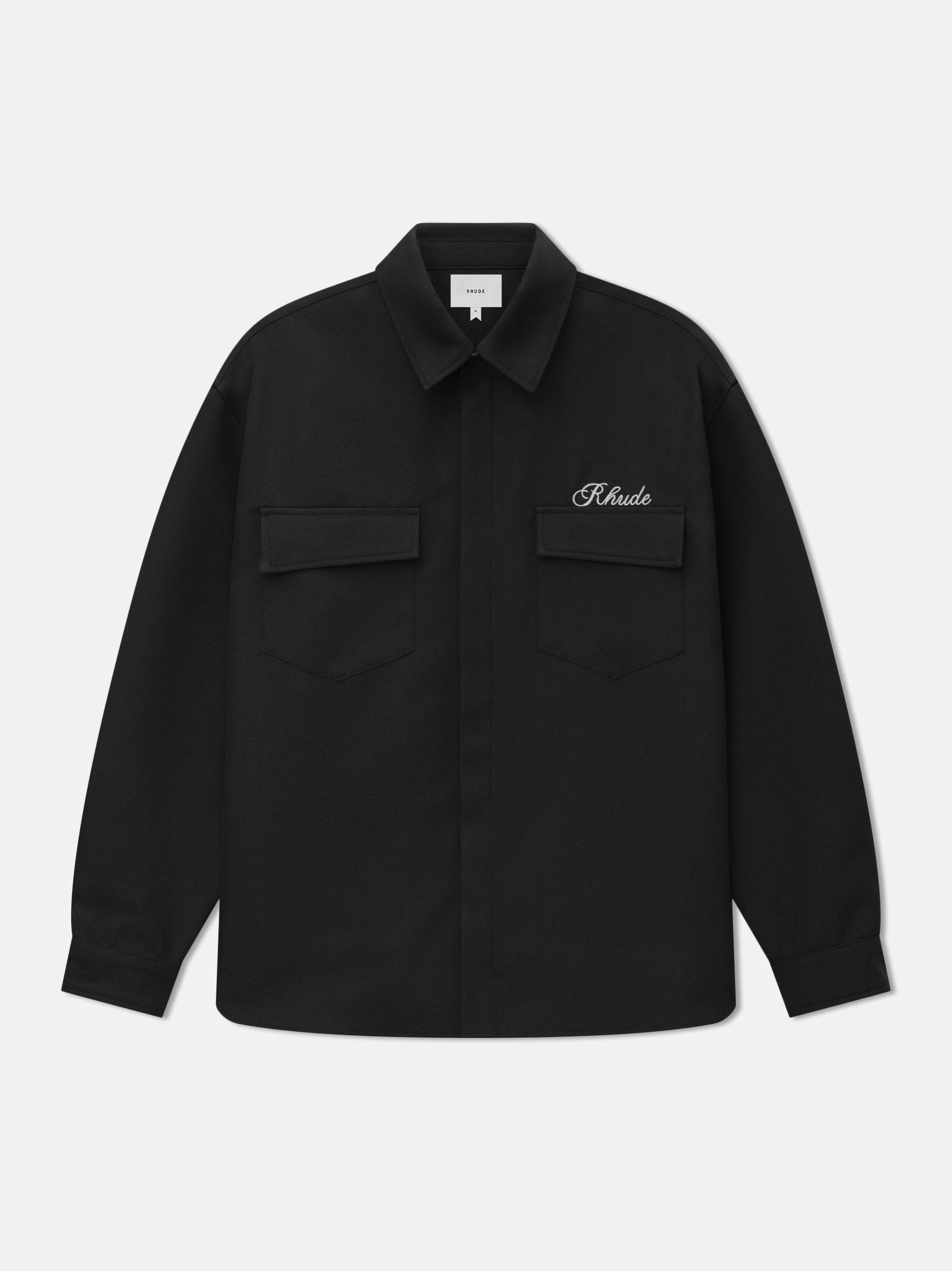 Premium long sleeve woven shirt crafted from mid-weight twill gabardine. Features Rhude logo embroidered at front chest, a camp collar, dual front pockets, button down styling, and flat hem. 100% TWILL WOOL GABARDINE