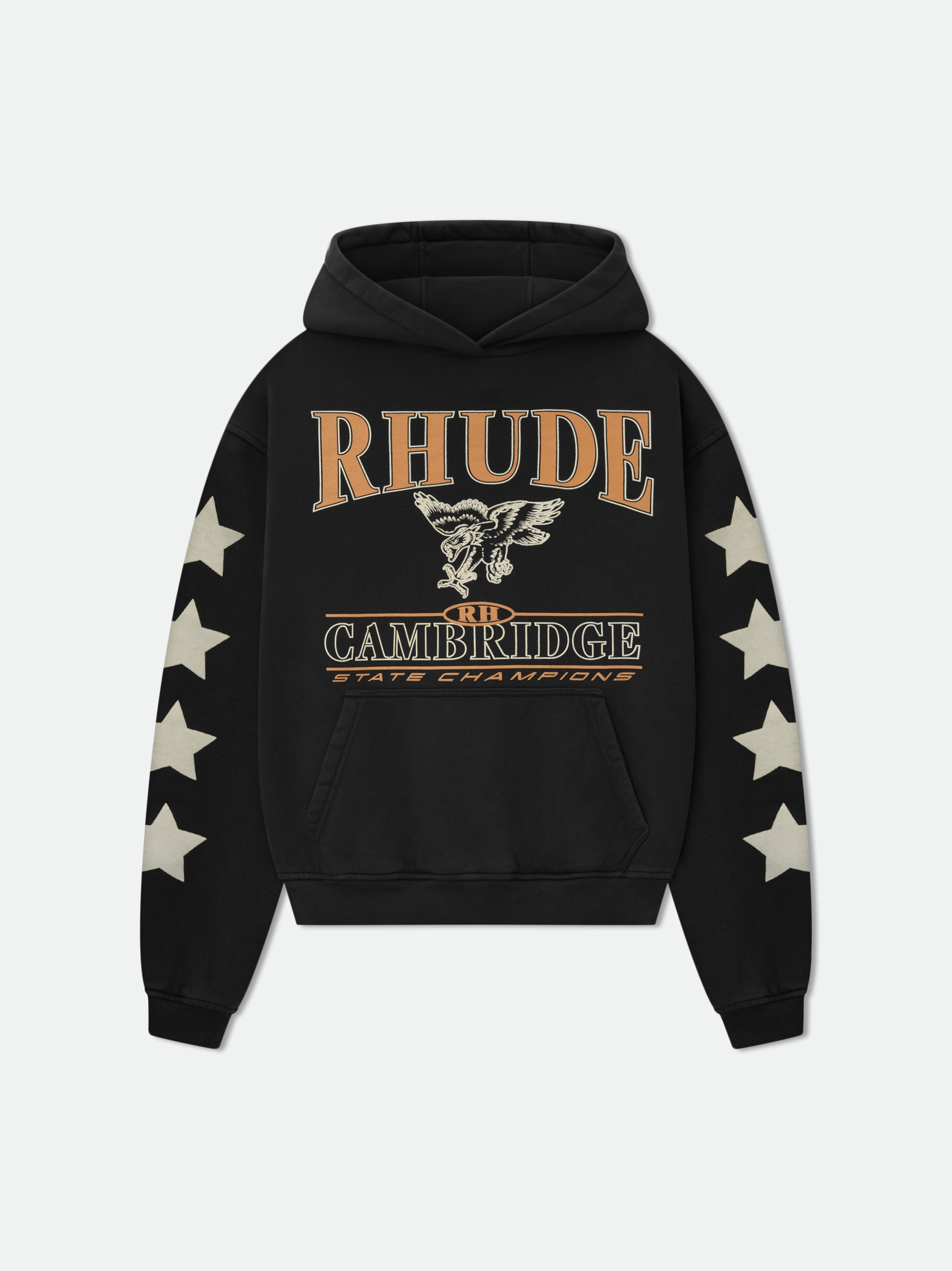 Long sleeve french terry hoodie with Rhude Cambridge graphic designs printed on the front and sleeves, with a clean back. Featuring a kangaroo front pocket and dropped shoulders. Each piece is unique and print distressing my vary per style. 100% COTTON