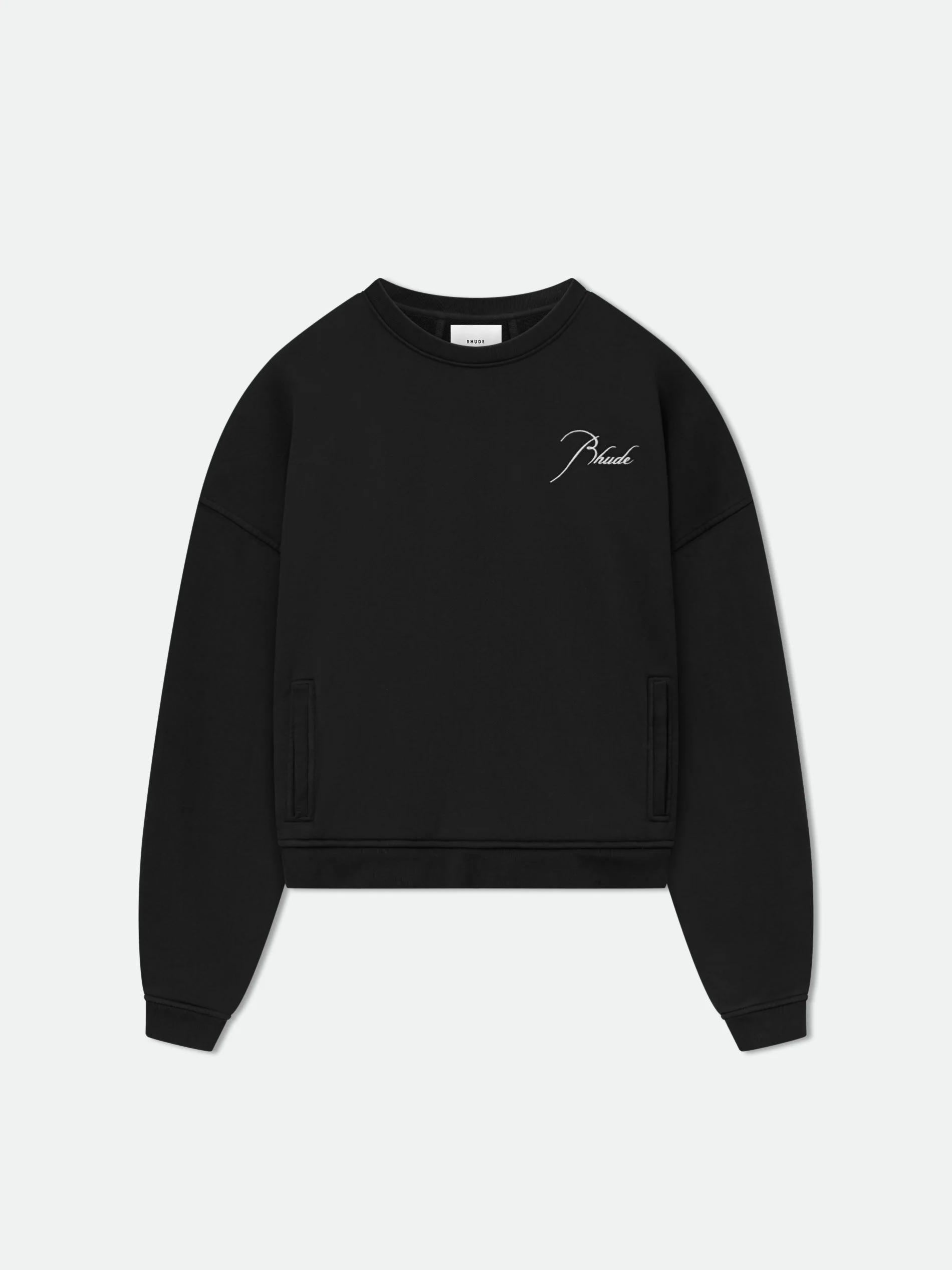 Long sleeve French Terry Crewneck with Rhude signature script logo embroidered on the front and back. Featuring a kangaroo front pocket and dropped shoulders. 100% COTTON