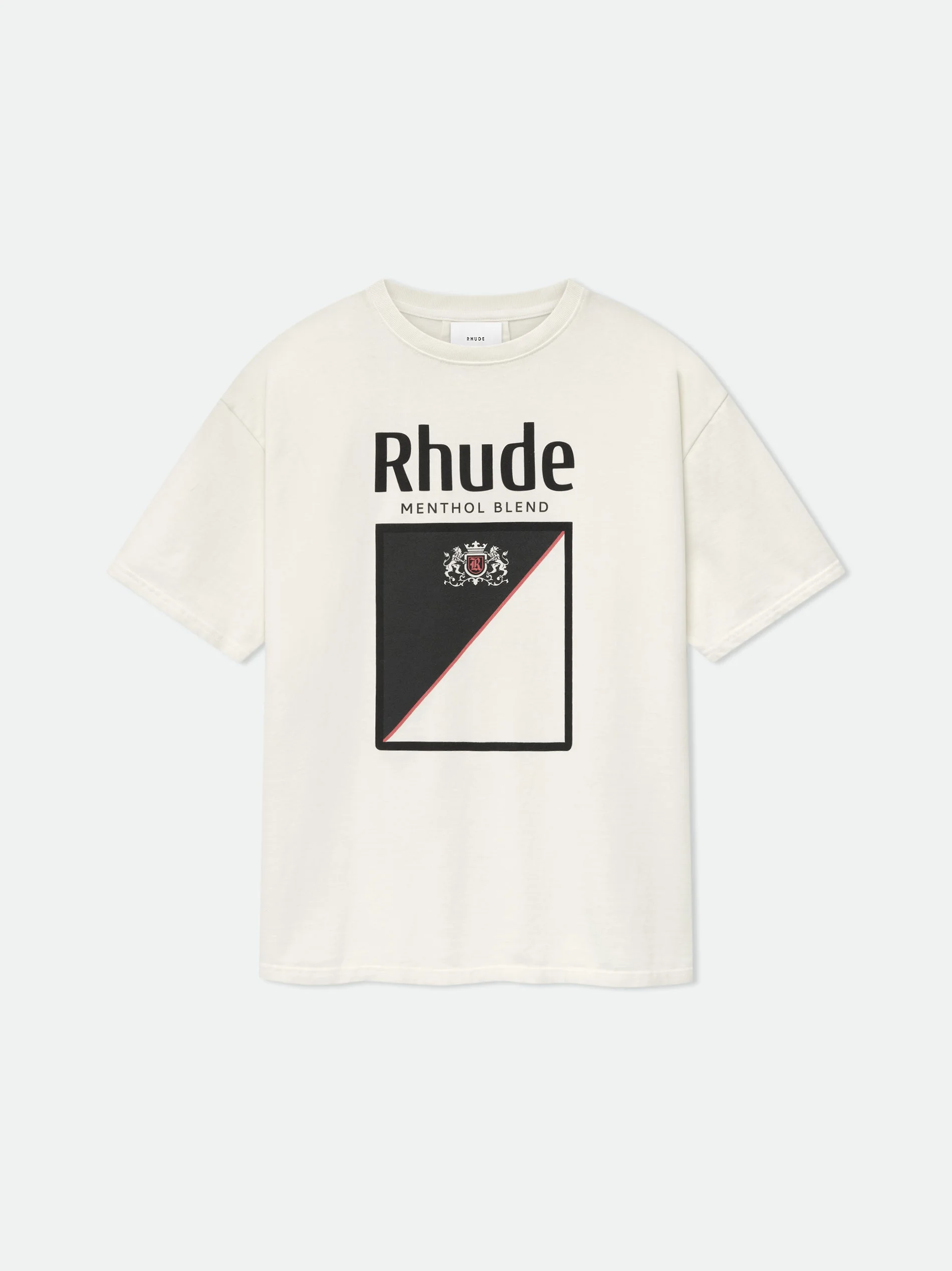 Custom-fit vintage wash cotton short sleeve tee-shirt with Rhude "Menthol Blend" fumar graphics printed at front, with a clean back. 100% COTTON