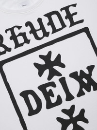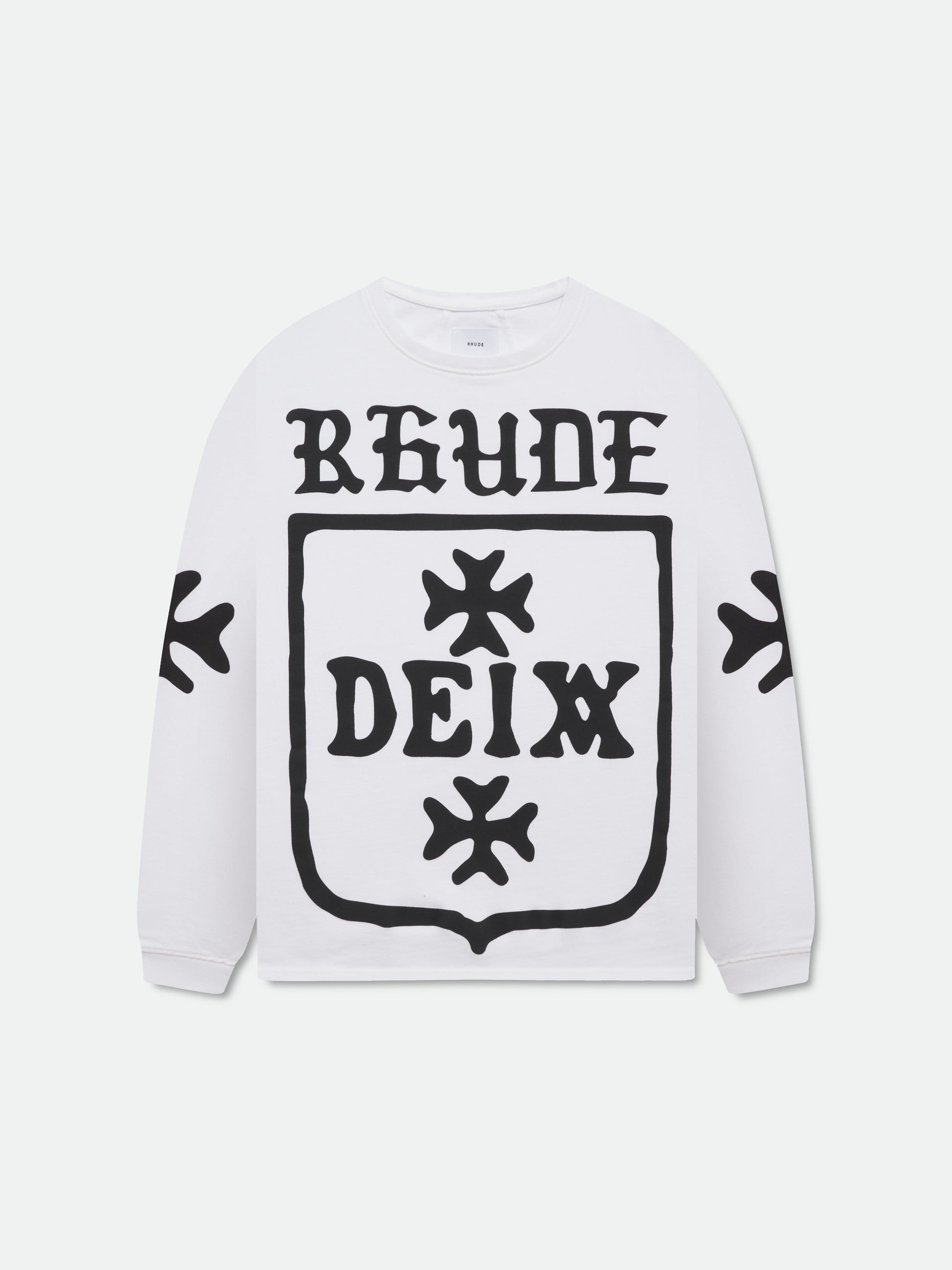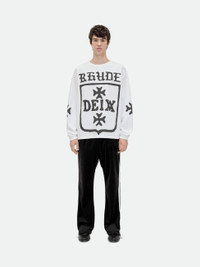 Custom-fit vintage wash oversized cotton long sleeve tee-shirt with Rhude Deix Shield graphics puff printed at front, with a clean back. 100% COTTON