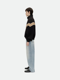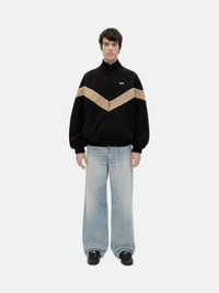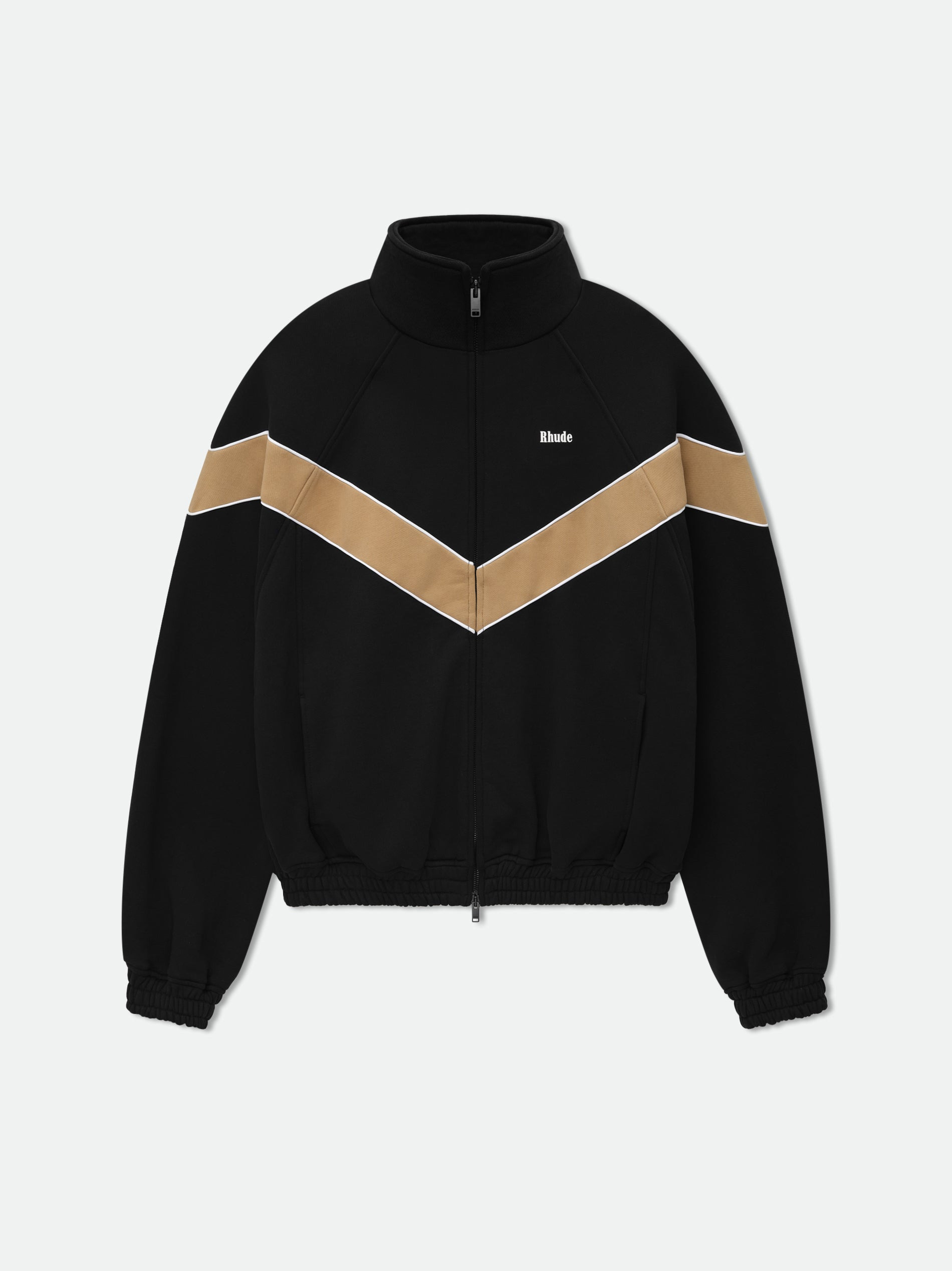 Premium fleece track jacket features a sleek stand collar and a versatile two-way zip closure. RHUDE classique logo is printed on the chest, while contrasting diagonal piping adds a dynamic touch. Practical welt pockets offer convenient storage, and the elasticized hem and cuffs ensure a comfortable, secure fit. Fully lined for added warmth and structure, making it a stylish and functional piece. 100% COTTON