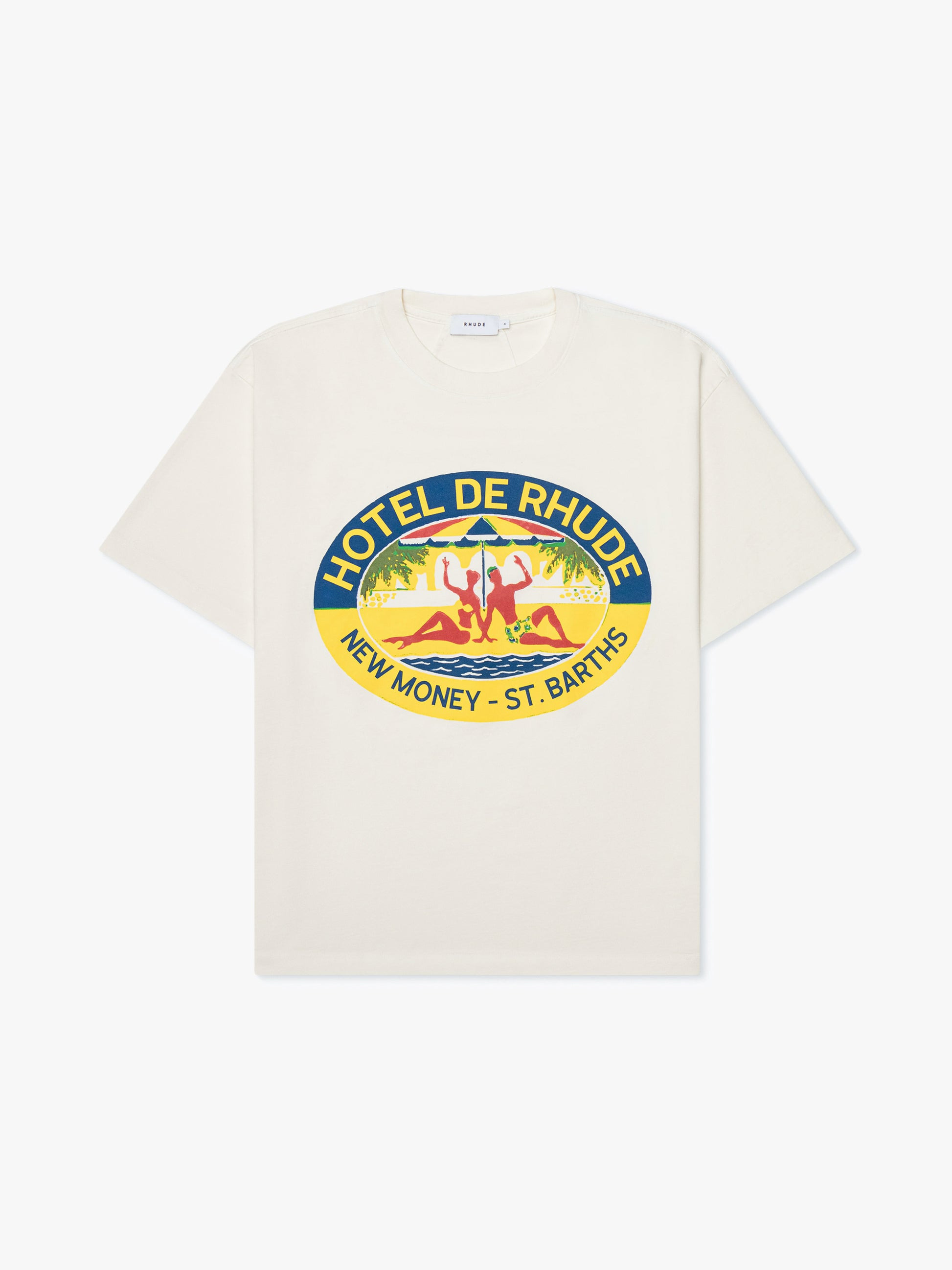 Custom-classic fit cotton tee shirt with a ribbed neckline and short sleeves. Features Hotel de RHUDE - New Money St. Barths graphic design printed on front. Item will ship during week of 12/9/24 or earlier. 100% COTTON