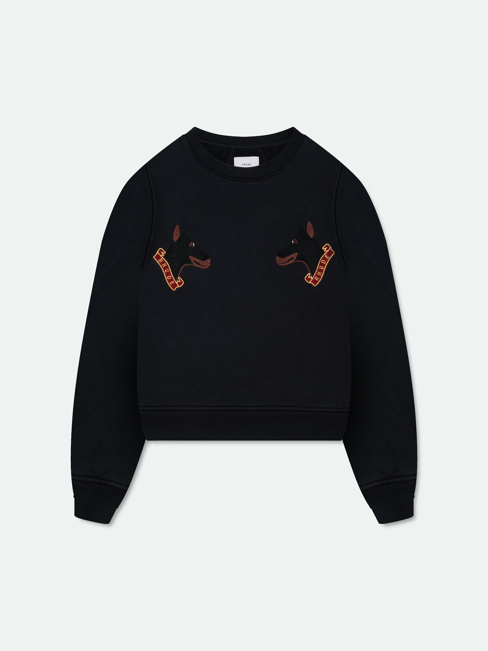 This long-sleeve cotton crewneck showcases the Rhude London Hounds embroidered on the front, with bold Rhude designs throughout the back. It features a comfortable pull over styling, and dropped shoulders for a relaxed, effortless fit. 100% COTTON