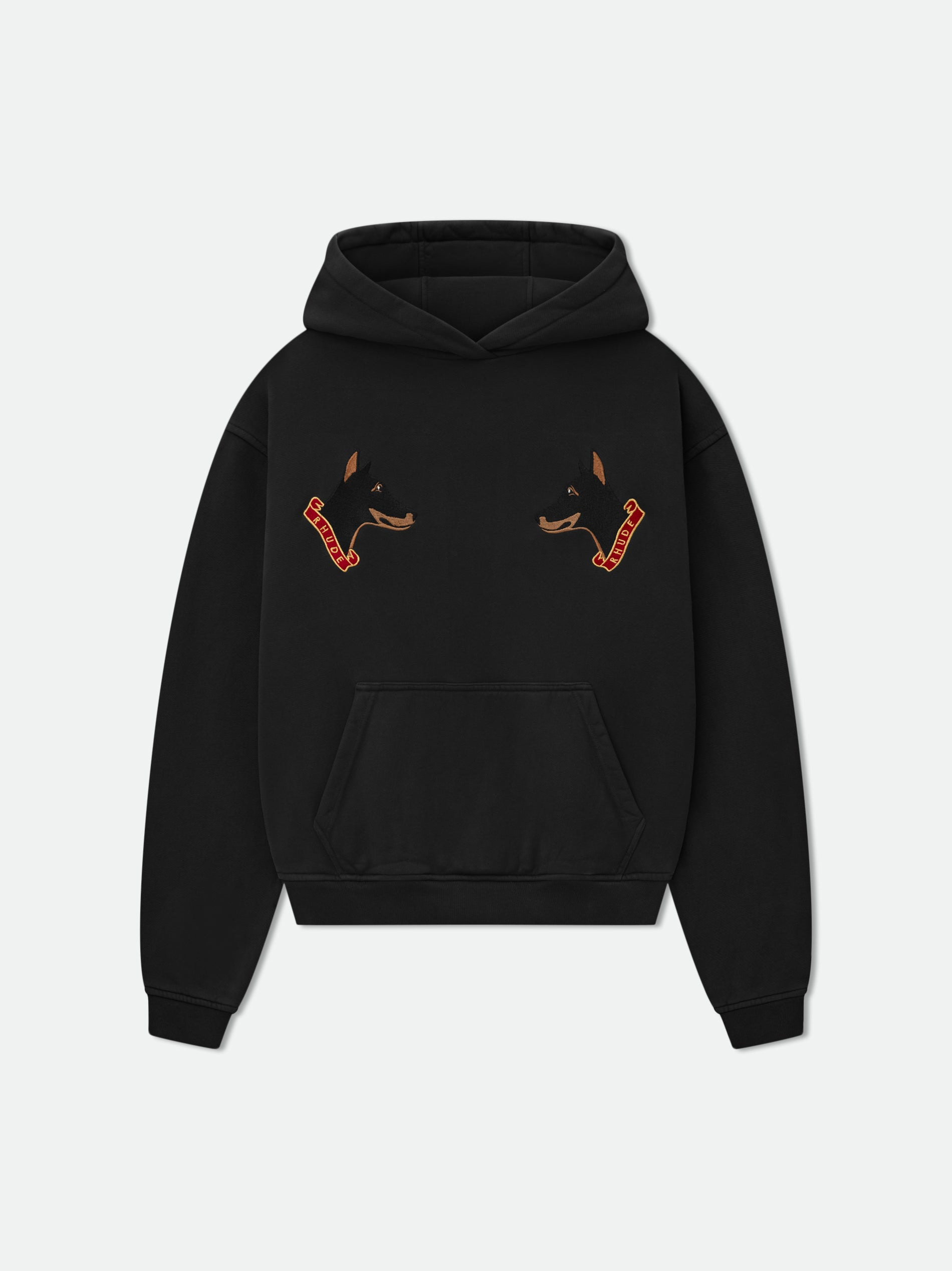 Long sleeve French Terry hoodie with Rhude london hounds on the front, with a rhude designs throughout the back. Featuring a kangaroo front pocket and dropped shoulders. Each piece is unique and print distressing my vary per style. 100% COTTON