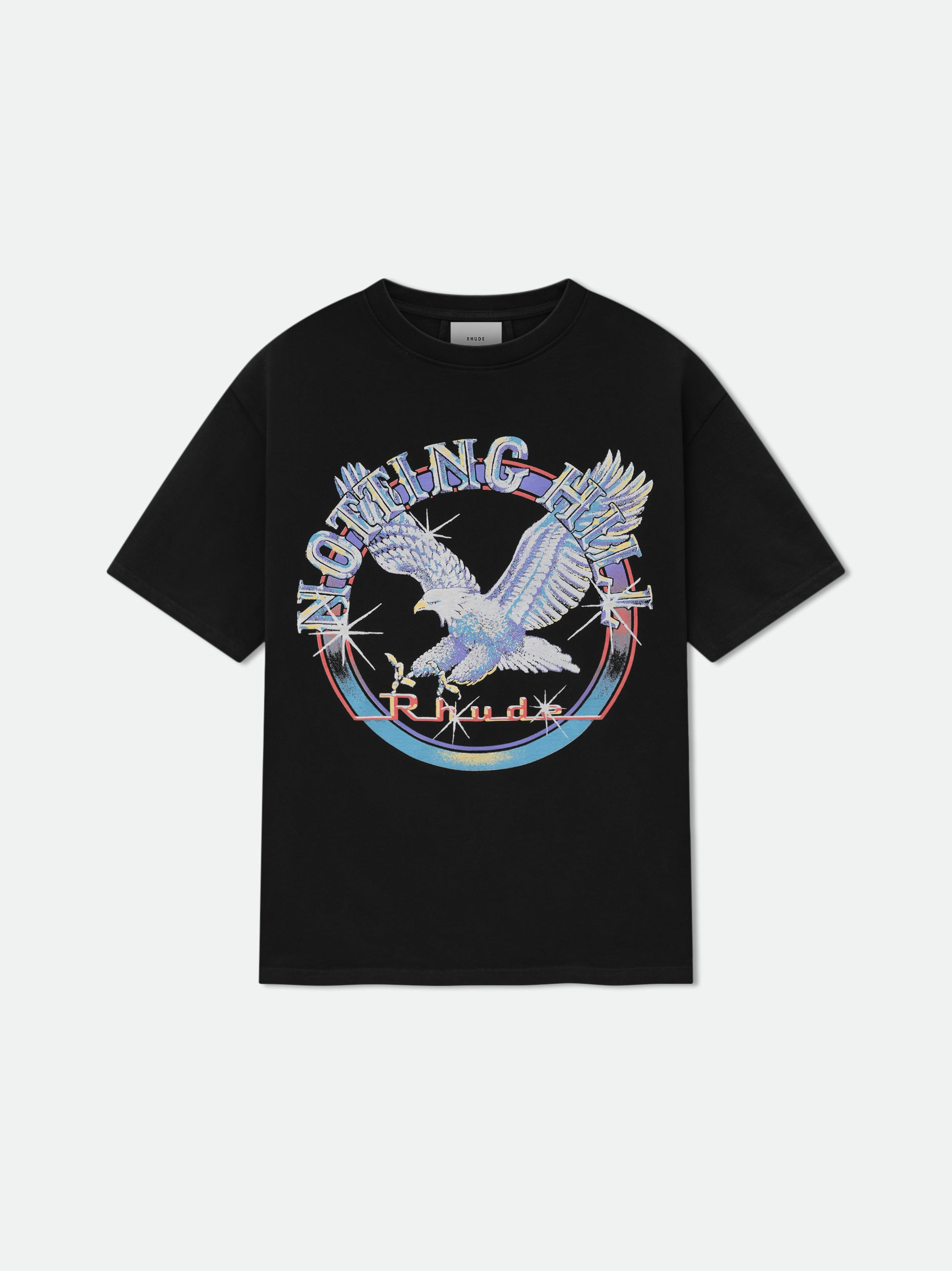 Custom-fit vintage wash cotton short sleeve tee-shirt with Rhude "Notting Hill Eagle" inspired designs printed at front, with a clean back. 100% COTTON