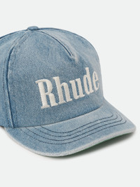 Heavyweight vintage denim cap with Rhude logo on front. Features an adjustable snap strap at the back, so you can adjust the fit to your preference, and green under brim. 100%COTTON/RIGID
