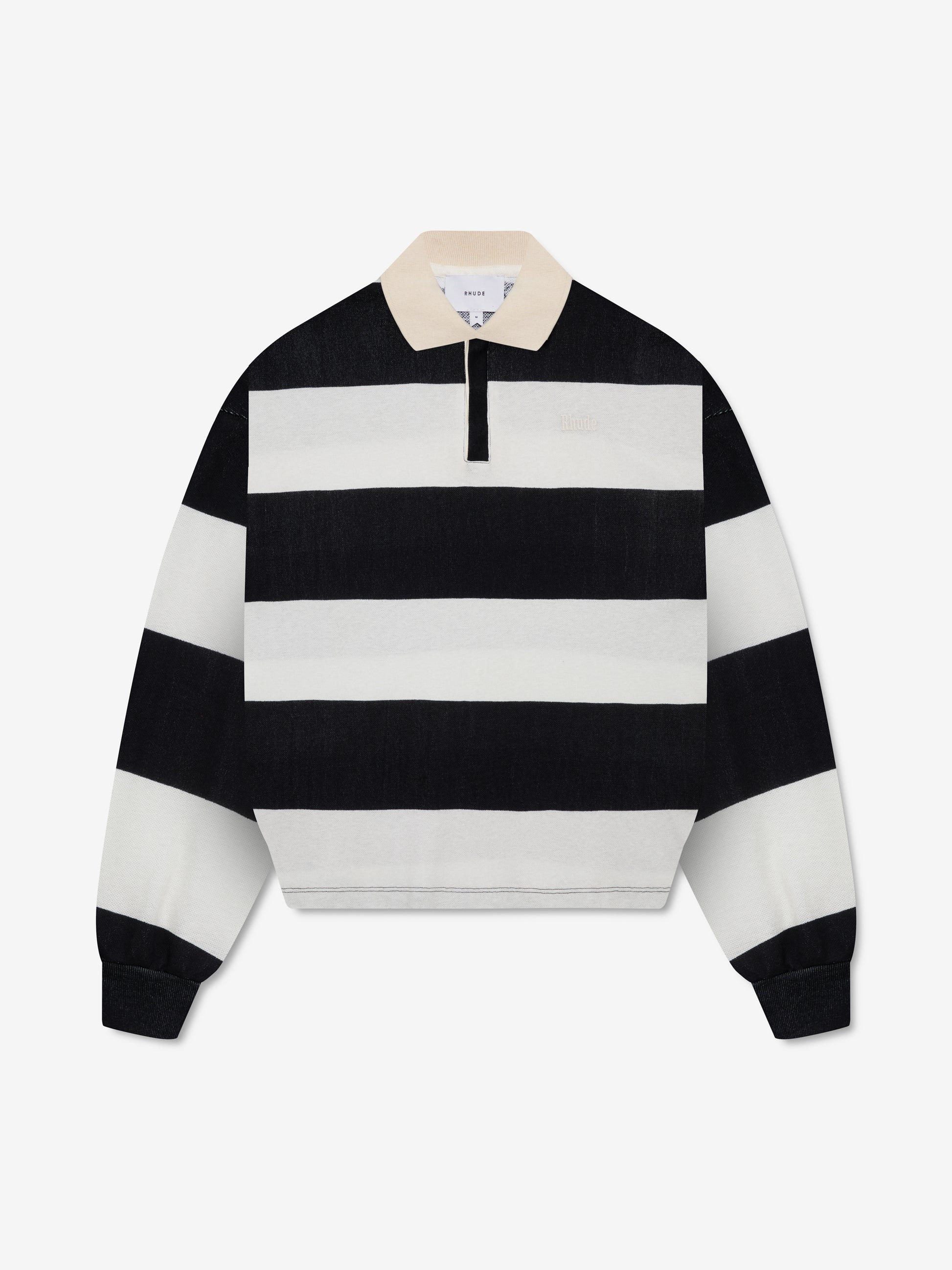 Premium long sleeve polo made from stylish pique cotton for a refined aesthetic and enhanced comfort. Quarter front opening at collar, with custom Rhude closures, and pull over styling. SELF: 100% COTTON RIB: 100% POLYESTER