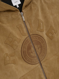Crafted from high-quality suede leather, this varsity jacket with a hood, boasts a Rhude two-way zipper with custom pill hardware. Features "Rhude" suede lettering patches, and a ribbed waist and cuffs. AW24 Runway 100% SUEDE/100% LYOCELL Standard fit - We recommend taking your standard size.
