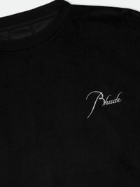Long sleeve velour crewneck with Rhude classique script logo embroidered on the front, with a clean back. Featuring a kangaroo front pocket, dropped shoulders, and pull over styling. 100% COTTON