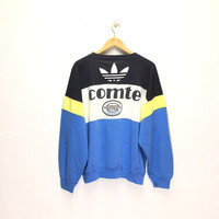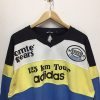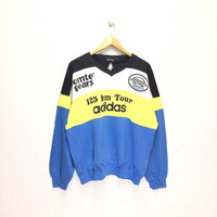 Please read all the description carefully before buying..if you have any questions feel free to ask (Check measurements below) Size : please refer to actual measurement given and compared with your best fitting clothes ) TAG BRAND :- Adidas SIZE ON TAG :- Large ACTUAL SIZE MEASUREMENT :- ARM PIT TO ARM PIT :- 25" Inches BACK COLLAR TO HEM :- 26" Inches CONDITION :-Good Vintage Condition/Refer Picture COLOUR:- Yellow / Blue / White MATERIAL : Cotton/Polyester PLEASE READ THE DESCRIPTION AND POLICY BEFORE BUYING