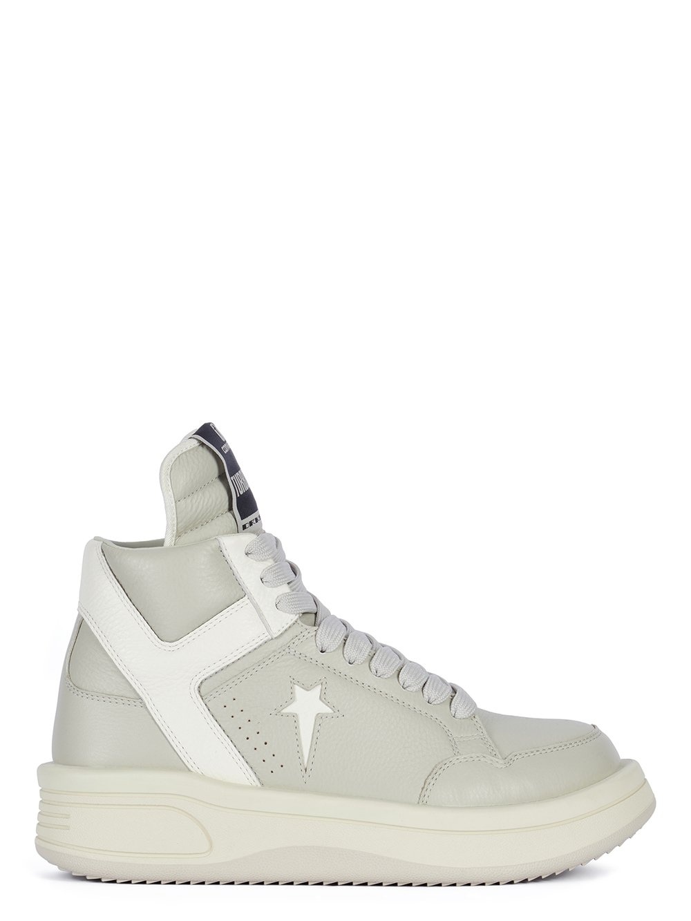 CONVERSE X DRKSHDW TURBOWPN IN OYSTER/WHITE THIS PREMIUM LEATHER UPPER LACED HIGH TOP SHOE IS BASED ON THE CLASSIC CONVERSE “WEAPON” MODEL ORIGINATING FROM THE MID 80’S AND FAMOUSLY WORN BY BASKET BALL PLAYERMAGIC JOHNSON. IT HAS THE SIGNATURE DRKSHDW ELONGATED TONGUE WITH CUSTOM BRANDED WRAP AROUND WOVEN LABEL, BEARING THE MODEL NAME, A WHITE LEATHER UPPER, WHITE SOLE AND OUTSOLE. IT FEATURES AN EXAGGERATED FOAM MOLDED TOE AND OVERSIZED WEAPON TOOLING WITH SIGNATURE DRKSHDW SAWTOOTH OUTSOLE. CX FOAM INTERNAL MIDSOLE AND CX FOAM SOCK LINER. IT HAS THE PENTAGRAM COLLAB LOGO ON THE LATERAL QUARTER, AIR VENT PERFORATIONS ON TOE AND SIDE, AND COLLAB LOGO ON THE SOLE. COLOR: OYSTER/WHITE MATERIAL: UPPER 100% COW LEATHER INSOLE 60% POLYURETHANE + 40% POLYESTER SOLE 100% RUBBER PLEASE NOTE THE SHOE SIZE LISTED ON THE PRODUCT DESCRIPTION PAGE CORRESPONDS TO USA MEN'S SHOE SIZE WE STRONGLY RECOMMEND OUR CLIENTS TO CHECK THE SIZE CHART BEFORE PLACING AN ORDER TO AVOID ANY POTENTIAL INCONVENIENCE FEEL FREE TO CONTACT CUSTOMERCARE@RICKOWENS.EU FOR ANY ASSISTANCE