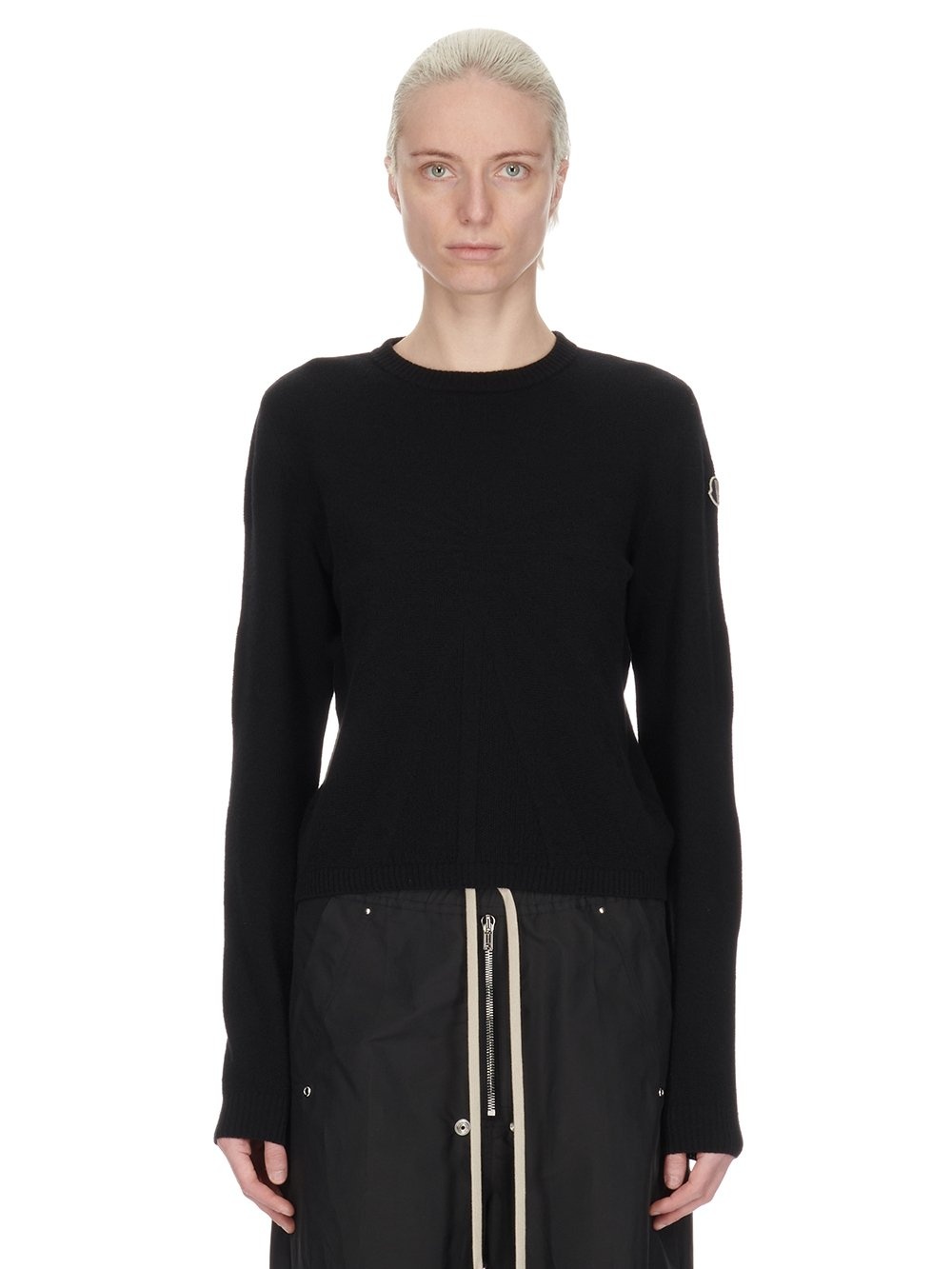 MONCLER + RICK OWENS FW24 BIKER ROUND NECK IN BLACK WOOL-CASHMERE BLEND THIS BIKER ROUND NECK SWEATER IS ABOVE-HIP LENGTH WITH LONG SLEEVES. IT HAS A RIBBED ROUND NECK, CUFFS AND HEM. IT FEATURES A SUBTLE RADIANCE JACQUARD KNIT DESIGN WITH LINES RADIATING OUT FROM A KNIT CHANNEL RUNNING DOWN THE CENTRE FRONT AND THE CENTRE BACK SPINE. IT HAS AN EMBROIDERED RICK OWENS + MONCLER PATCH HIGH ON THE LEFT ARM THIS MEDIUMWEIGHT CLASSIC STITCH KNIT HAS A SOFT AND WARM HAND FEEL - COLOR: BLACK - MATERIAL: 90% NEW WOOL + 10% CASHMERE - MALE MODEL IS 189 CM TALL, FEMALE MODEL IS 181 CM TALL - MALE MODEL IS WEARING SIZE M, FEMALE MODEL IS WEARING SIZE XS