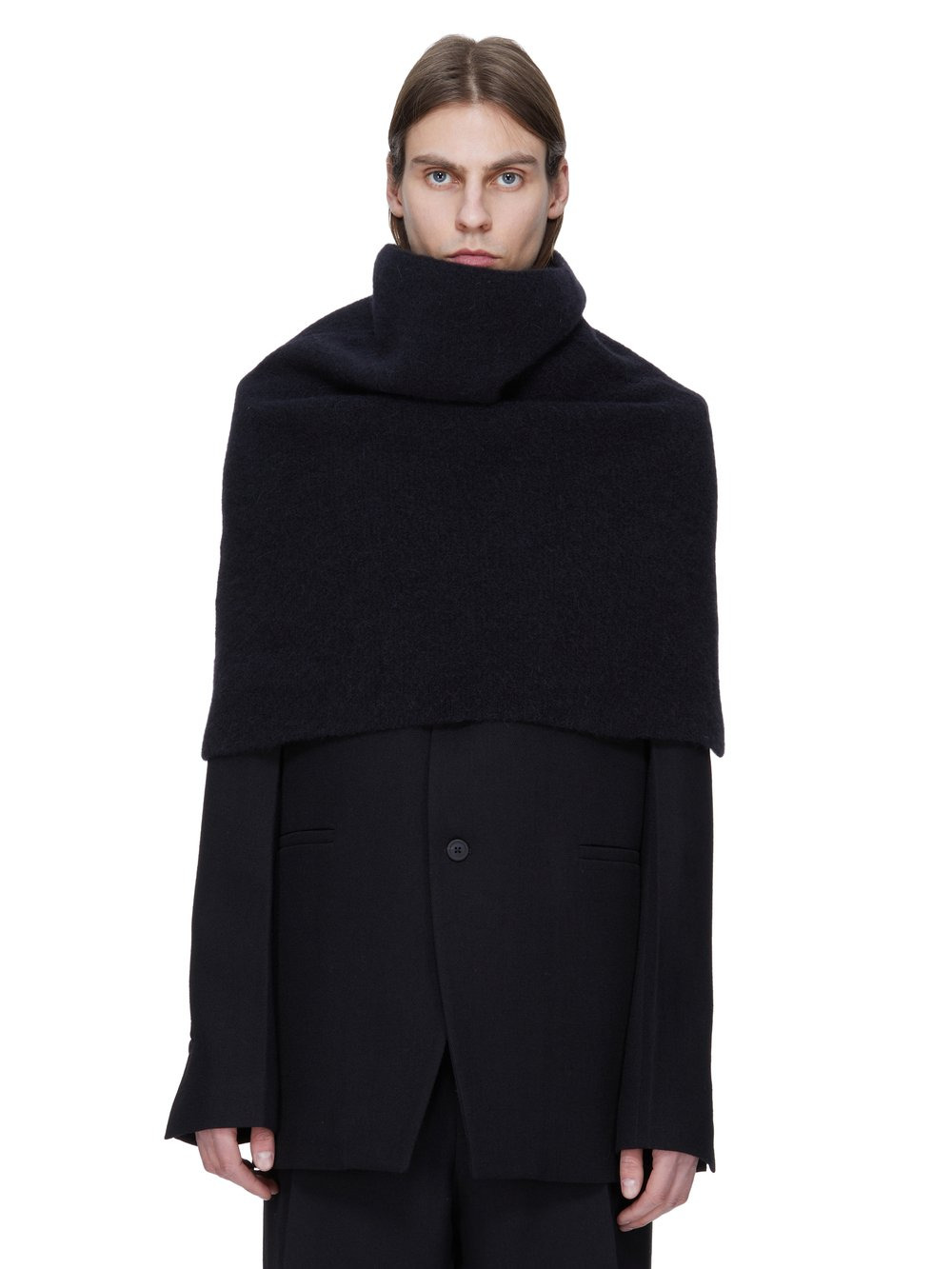 RICK OWENS FW25 CONCORDIANS RUNWAY COWL IN BLACK ALPACA KNIT THIS COWL FITS OVER THE HEAD AND PULLED DOWN TO ABOVE ELBOW LENGTH. IT FITS SNUGLY OVER THE UPPER BODY AND FEATURES A COWL NECK THIS IS A DENSE BUT LIGHT KNIT WITH A SOFT SLIGHTLY FLUFFY HAND COLOR: BLACK MATERIAL: 48% ALPACA + 30% NYLON + 20% WOOL + 2% ELASTANE MODEL IS 189CM TALL ITEM IS AVAILABLE IN ONE SIZE