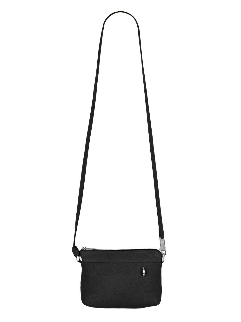 RICK OWENS FW25 CONCORDIANS SMALL ADRI IN BLACK BLISTER LAMB LEATHER THIS SMALL ADRI IS A RECTANGULAR POUCH WITH TOP ZIPPER CLOSURE, A PONTICELLO D-LOOP DETAIL AND A LONG, THIN, ADJUSTABLE LEATHER STRAP, WITH SMALL PALLADIUM TONE BRASS SNAP HOOKS AND D-RINGS THIS LIGHTWEIGHT LAMB LEATHER HAS AN EXAGGERATED, UNEVEN BLISTERED TEXTURE AND A SOFT, FLUID HANDFEEL. THE BLISTERED TEXTURE IS ACHIEVED BY EXAGGERATING THE NATURAL GRAIN TEXTURE OF EACH SKIN, THEREFORE THE LOOK OF EACH SKIN IS UNIQUE THIS LEATHER IS MADE BY A THIRD GENERATION FAMILY OWNED TANNERY IN THE SOUTH OF ITALY COLOR: BLACK MATERIAL: 100% LAMB LEATHER PADDING 100% RECYCLED POLYESTER IT MEASURES 17CM X 14CM X 6CM