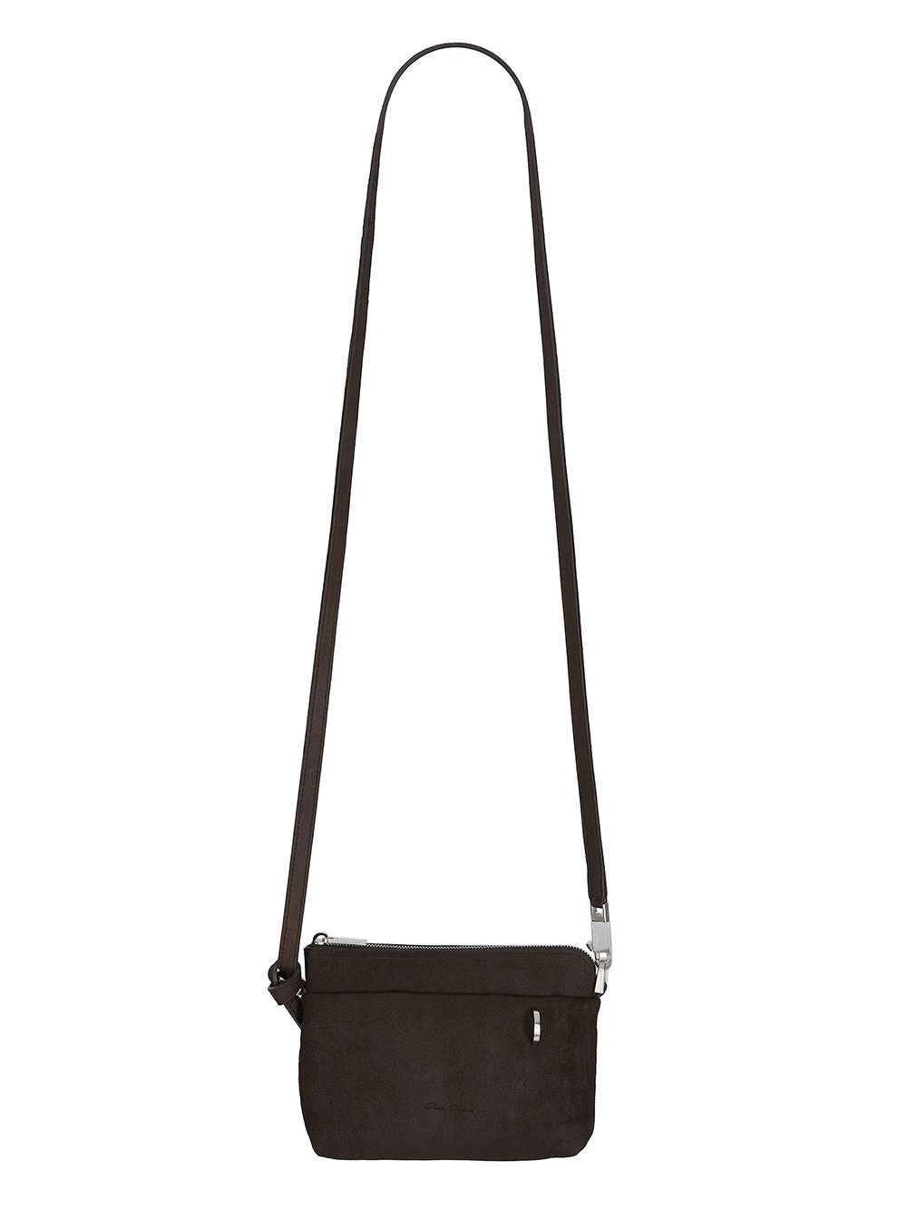 RICK OWENS FW25 CONCORDIANS SMALL ADRI IN DARK DUST BLISTER LAMB LEATHER THIS SMALL ADRI IS A RECTANGULAR POUCH WITH TOP ZIPPER CLOSURE, A PONTICELLO D-LOOP DETAIL AND A LONG, THIN, ADJUSTABLE LEATHER STRAP, WITH SMALL PALLADIUM TONE BRASS SNAP HOOKS AND D-RINGS THIS LIGHTWEIGHT LAMB LEATHER HAS AN EXAGGERATED, UNEVEN BLISTERED TEXTURE AND A SOFT, FLUID HANDFEEL. THE BLISTERED TEXTURE IS ACHIEVED BY EXAGGERATING THE NATURAL GRAIN TEXTURE OF EACH SKIN, THEREFORE THE LOOK OF EACH SKIN IS UNIQUE THIS LEATHER IS MADE BY A THIRD GENERATION FAMILY OWNED TANNERY IN THE SOUTH OF ITALY COLOR: DARK DUST MATERIAL: 100% LAMB LEATHER PADDING 100% RECYCLED POLYESTER IT MEASURES 17CM X 14CM X 6CM