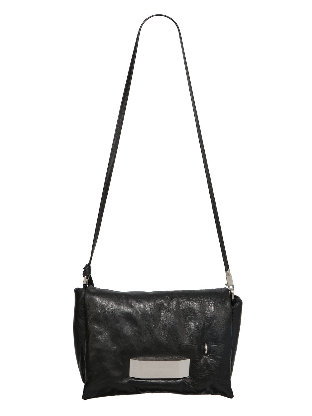 RICK OWENS SS26 TEMPLE BIG PILLOW GRIFFIN IN BLACK TUMBLED LAMB THIS BIG PILLOW GRIFFIN IS A LARGE RECTANGULAR, SOFT PADDED BAG, WITH A FRONT FLAP, WITH A PALLADIUM INDENTED EASY-GRIP BEVEL AND MAGNETIC CLOSURE. IT HAS ONE PONTICELLO D-LOOP ON FRONT, AN INNER POCKET WITH 9 CARD SLOTS AND A SECOND INNER ZIPPERED POCKET. IT FEATURES A LONG THIN LEATHER STRAP WITH A PALLADIUM TONE BRASS HOOK WHICH TIES ON ONE SIDE, OR CAN BE DETACHED TO CREATE A CLUTCH THIS MEDIUMWEIGHT LAMB LEATHER IS VEG TANNED AND FINISHED WITH ANILINE. THE SURFACE TEXTURE, WHICH IS THE NATURAL GRAIN OF THE SKIN, IS ACHIEVED BY TUMBLING THE SKINS FOR 15 HOURS IN A WOODEN DRUM VEG TANNING MEANS ONLY VEGETAL AND NATURAL TANNINS WERE USED IN THE PROCESS OF TANNING AND PRESERVING THIS LEATHER THIS TANNERY IS LWG AUDITED COLOR: BLACK MATERIAL:100% LAMB LEATHER PADDING 100% RECYCLED POLYESTER WIDTH 32CM HEIGHT 22CM DEPTH 10CM