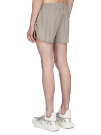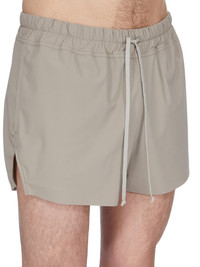 RICK OWENS SS26 TEMPLE BOXER SWIMMER IN TAUPE SWIM JERSEY THIS BOXER SWIMMER IS MID-THIGH LENGTH. IT HAS AN ELASTICIZED WAISTBAND WITH DRAWSTRING, SIDE POCKETS AND BEVELED SIDE SPLITS. THIS BOXER IS DESIGNED FOR SWIMMING, OR SPORT, AND HAS AN INTERNAL BRIEF THIS MEDIUMWEIGHT MATTE SWIMWEAR JERSEY HAS COMFORT STRETCH AND IS PRODUCED ESPECIALLY FOR SWIMWEAR WITH HIGH UV AND CHLORINE RESISTANCE IT IS MADE USING ECONYL® RECYCLED POLYAMIDE, MADE FROM 100% WASTE MATERIAL THAT WOULD OTHERWISE POLLUTE THE EARTH COLOR: TAUPE MATERIAL:79% NYLON + 21% ELASTANE UNDERPANTS 92% NYLON + 8% ELASTANE MODEL IS 189CM TALL