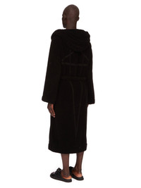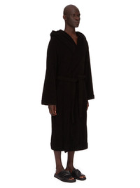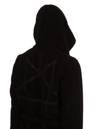 RICK OWENS PENTAGRAM BATHROBE IN BLACK COTTON THIS PENTAGRAM BATHROBE IS MID-CALF LENGTH. IT HAS LONG SLEEVES AND A WRAP FRONT THAT SECURES WITH A TIE BELT. IT HAS ROUNDED BAUHAUS PATCH POCKETS, A BIG HOOD AND FEATURES A LARGE PENTAGRAM DESIGN, IN RELIEF, ON THE BACK - COLOR: BLACK - MATERIAL: 100% COTTON