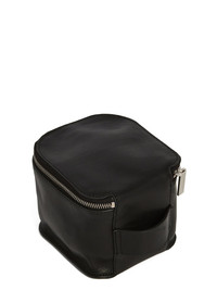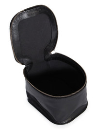 RICK OWENS SMALL BEAUTY CASE IN BLACK COW LEATHER THIS RICK OWENS SMALL BEAUTY CASE IS A DEEP, SQUARE LEATHER CASE WITH A ZIPPER AROUND THREE OF THE TOP EDGES. IT HAS A LEATHER CARRYING STRAP ATTACHED TO THE BACKSIDE AND A ZIPPER ENGRAVED WITH THE RICK OWENS LOGO COLOR: BLACK MATERIAL: 100% COW LEATHER MEASUREMENTS 12CM X 12CM X 9CM
