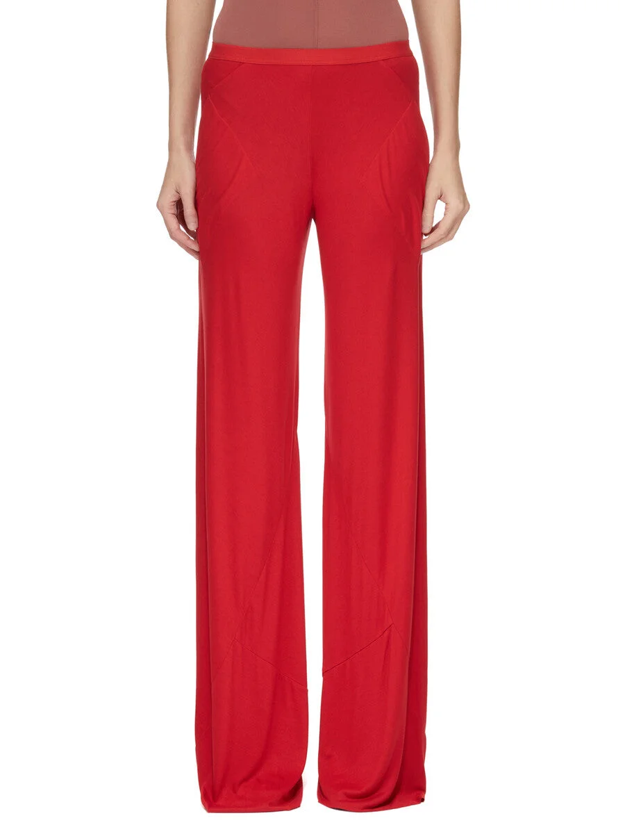 RICK OWENS SS26 TEMPLE BIAS PANTS IN CARDINAL RED FLUID VISCOSE JERSEY THESE BIAS PANTS ARE FLOOR LENGTH, WITH A LOOSE FIT. THEY HAVE AN ELASTICIZED WAIST, SIDE POCKETS, WIDE DRAPED LEGS AND BIAS SEAMS. THIS MEDIUMWEIGHT AND FLUID VISCOSE JERSEY IS BRUSHED WITH A SOFT HANDFEEL. THIS JERSEY IS MADE FROM FSC® - CERTIFIED (FSC - C162846) VISCOSE WHICH ENSURES THAT THE FIBERS ARE PRODUCED FROM RESPONSIBLY MANAGED SOURCES AND NO DEFORESTATION OCCURS. COLOR: CARDINAL RED MATERIAL:100% VISCOSE MODEL IS 181CM TALL MODEL WEARS SIZE 40