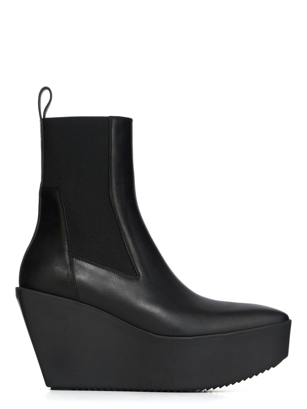RICK OWENS FW25 CONCORDIANS SLIVER PLATFORM BEATLES IN BLACK WASHED CALF LEATHER THESE SLIVER PLATFORM BEATLES ARE ABOVE-ANKLE HEIGHT. THEY HAVE THEY HAVE A TOPSTITCHED SEAM ARCING OVER THE FRONT FOOT WITH A FLAT STRAP RUNNING OVER ON ANTERIOR ANKLE, SIDE PANELS IN STRETCH ELASTIC, AN ANGULAR HEEL COUNTER AND A BACK LOOP PULL TAB. THEY FEATURE A SOLE WITH SLANTING HEEL (11CM AT HEEL, 4,5CM AT TOE) AND INCLINE PLATFORM WITH A SQUARE TOE THIS MEDIUMWEIGHT COW LEATHER IS VEG TANNED AND FINISHED USING NATURAL WAXES. A FINAL WASH GIVES THIS LEATHER ITS SOFTNESS AND BRINGS OUT THE NATURAL GRAIN TEXTURE OF EACH SKIN. BECAUSE THIS SKIN IS NAKED, NOT FINISHED USING ANY PIGMENTS COVERING THE SKIN, NATURAL MARKINGS AND SHADINGS ARE VISIBLE WHICH MAKES EACH SKIN AND PRODUCT UNIQUE VEG TANNING MEANS ONLY VEGETAL AND NATURAL TANNINS WERE USED IN THE PROCESS OF TANNING AND PRESERVING THIS LEATHER THIS TANNERY IS LWG CERTIFIED WITH A SILVER RATING COLOR: BLACK MATERIAL: UPPER 100% CALF LEATHER LINING 100% CALF LEATHER INSOLE 100% CALF LEATHER SOLE 100% THERMOPLASTIC RUBBER SOLE AT HEEL 11CM - SOLE AT TOE 4,5CM