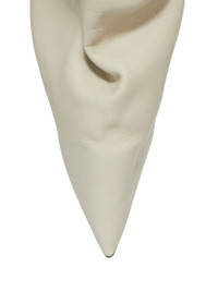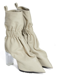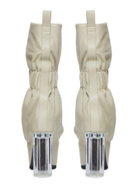 RICK OWENS SS26 TEMPLE PULL ON CUFFED TAQUITO SAND/CLEAR GRAINY COW LEATHER THESE PULL ON CUFFED TAQUITO ARE A SHORTER, DEFLATED, VERSION OF OUR STRAYTUKAY COLLABORATION BOOTS. THEY ARE ABOVE ANKLE HEIGHT. THEY FEATURE A LEATHER UPPER THAT FLARES DOWN FROM ABOVE ANKLE AND IS ELASTICIZED AROUND THE ANKLE, CREATING A SLIGHT DRAPE. IT THEN CURVES INTO THE BACK HEEL AND POINTS AT THE TOE. THEY HAVE A 12CM HEEL, A THICK FRONT PLATFORM (7,5CM) AND A 4,5CM RISE AND A BACK PULL TAB. THIS MEDIUMWEIGHT COW LEATHER HAS A SUBTLE GRAIN TEXTURE AND NATURAL HANDFEEL. TANNED IN THE VENETO AREA OF ITALY, THIS LEATHER IS TUMBLED MULTIPLE TIMES IN A LARGE DRUM IN ORDER TO BRING OUT THE NATURAL GRAIN TEXTURE OF THE SKIN. THE LEATHER IS FINISHED WITH ANILINE AND AIR-DRYED IN ORDER TO ACHIEVE THE NATURAL AND WAXY HANDFEEL. THIS TANNERY IS LWG CERTIFIED WITH A SILVER RATING. COLOR: SAND/CLEAR MATERIAL: UPPER 100% CALF LEATHER LINING 100% CALF LEATHER INSOLE 100% CALF LEATHER SOLE 100% COW LEATHER SOLE DETAIL 100% RUBBER PLATFORM AT TOE 7,5CM AT HEEL 12CM RISE 4,5CM