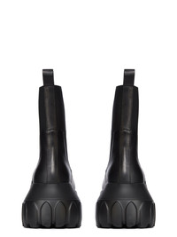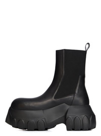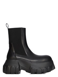 RICK OWENS FW25 CONCORDIANS BEATLE MEGA TRACTOR IN BLACK WASHED CALF LEATHER THESE BEATLE MEGA TRACTORS ARE ABOVE-ANKLE HEIGHT. THEY HAVE GEOMETRIC SIDE PANELS IN STRETCH ELASTIC, AN ANGULAR HEEL COUNTER WITH TOP STITCHING, A BACK LOOP PULL TAB AND A ROUNDED BOZO TOE. THEY FEATURE A DOUBLE HEIGHT MEGA TRACTOR SOLE THIS MEDIUMWEIGHT COW LEATHER IS VEG TANNED AND FINISHED USING NATURAL WAXES. A FINAL WASH GIVES THIS LEATHER ITS SOFTNESS AND BRINGS OUT THE NATURAL GRAIN TEXTURE OF EACH SKIN. BECAUSE THIS SKIN IS NAKED, NOT FINISHED USING ANY PIGMENTS COVERING THE SKIN, NATURAL MARKINGS AND SHADINGS ARE VISIBLE WHICH MAKES EACH SKIN AND PRODUCT UNIQUE VEG TANNING MEANS ONLY VEGETAL AND NATURAL TANNINS WERE USED IN THE PROCESS OF TANNING AND PRESERVING THIS LEATHER THIS TANNERY IS LWG CERTIFIED WITH A SILVER RATING COLOR: BLACK MATERIAL: UPPER 100% CALF LEATHER LINING 100% CALF LEATHER INSOLE 100% CALF LEATHER SOLE 100% E.V.A SOLE AT HEEL 9CM - SOLE AT TOE 6CM