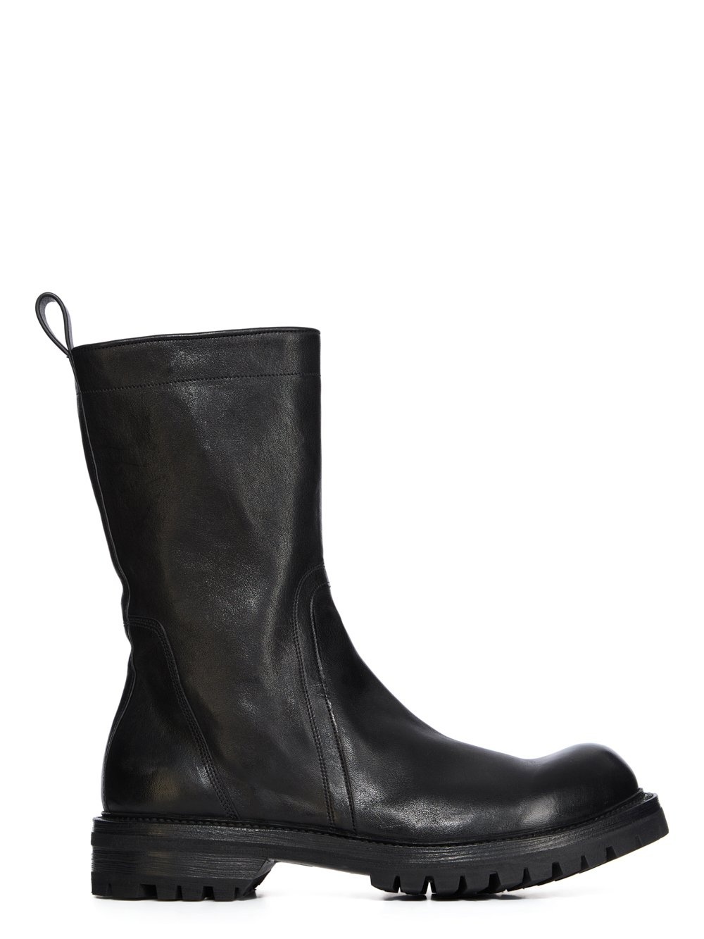 RICK OWENS FW25 CONCORDIANS ARMY CREEPER IN BLACK WAXY GOAT LEATHER THIS ARMY CREEPER IS AN ABOVE-ANKLE HEIGHT BOOT WITH AN INSIDE ANKLE ZIP. THEY HAVE A TOPSTITCHED SEAM ARCHING OVER THE FRONT FOOT, A STITCHED HEEL COUNTER AND A HAVE BACK PULL TAB. THEY FEATURE A CLASSIC ARMY SOLE THIS MEDIUMWEIGHT GOAT LEATHER HAS A NATURAL GRAIN TEXTURE AND A WAXY HANDFEEL TANNED IN THE NAPLES AREA OF ITALY, THIS LEATHER IS TUMBLED MULTIPLE TIMES IN A LARGE DRUM IN ORDER TO BRING OUT THE NATURAL GRAIN TEXTURE OF THE SKIN. THE LEATHER IS FINISHED WITH NATURAL WAXES IN ORDER TO ACHIEVE THE NATURAL AND WAXY HANDFEEL BECAUSE THIS SKIN IS NAKED, NOT FINISHED USING ANY PIGMENTS COVERING THE SKIN, NATURAL MARKINGS AND SHADINGS ARE VISIBLE WHICH MAKES EACH SKIN AND PRODUCT UNIQUE VEG TANNING MEANS ONLY VEGETAL AND NATURAL TANNINS WERE USED IN THE PROCESS OF TANNING AND PRESERVING THIS LEATHER THIS TANNERY IS LWG CERTIFIED WITH A GOLD RATING COLOR: BLACK MATERIAL: UPPER 100% RAM LEATHER LINING 100% CALF LEATHER SOLE 100% RUBBER SOLE AT HEEL 3CM - SOLE AT TOE 1,5CM