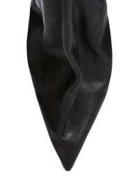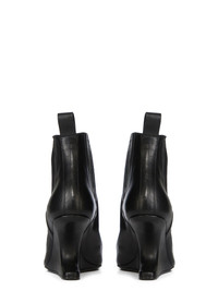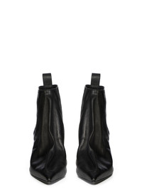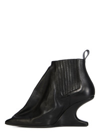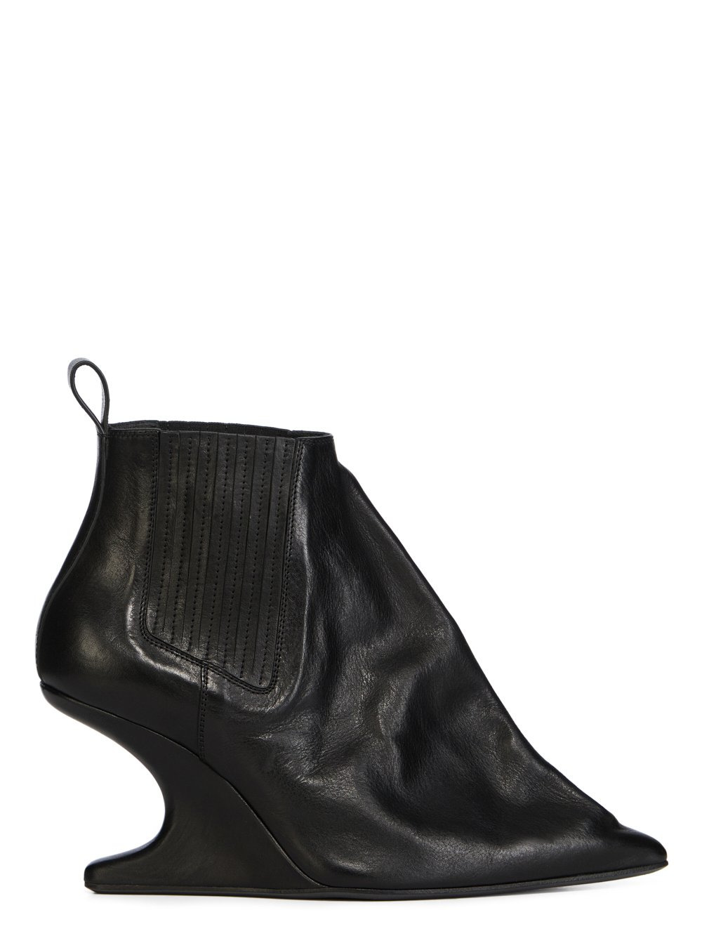 RICK OWENS FW25 CONCORDIANS RUNWAY ANKLE TACO IN BLACK WASHED CALF LEATHER THESE ANKLE TACO ARE JUST UNDER ANKLE HEIGHT. THEY FEATURE A LEATHER UPPER THAT FLARES OUT AT THE FRONT AND POINTS AT THE TOE. THEY FEATURE AN 8CM CANTILEVER HEEL, ELASTICIZED SIDE PANELS AND A BACK PULL TAB. THIS HEAVYWEIGHT COW LEATHER IS VEG TANNED AND FINISHED USING NATURAL WAXES. A FINAL WASH GIVES THIS LEATHER ITS SOFTNESS AND BRINGS OUT THE NATURAL GRAIN TEXTURE OF EACH SKIN. BECAUSE THIS SKIN IS NAKED, NOT FINISHED USING ANY PIGMENTS COVERING THE SKIN, NATURAL MARKINGS AND SHADINGS ARE VISIBLE WHICH MAKES EACH SKIN AND PRODUCT UNIQUE VEG TANNING MEANS ONLY VEGETAL AND NATURAL TANNINS WERE USED IN THE PROCESS OF TANNING AND PRESERVING THIS LEATHER THIS TANNERY IS LWG CERTIFIED WITH A SILVER RATING COLOR: BLACK MATERIAL: UPPER 100% CALF LEATHER LINING 100% CALF LEATHER INSOLE 100% CALF LEATHER HEEL HEIGHT 8CM