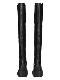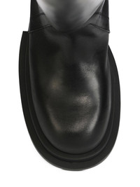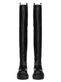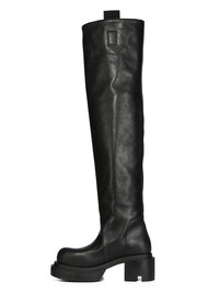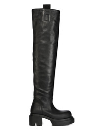 RICK OWENS FW25 CONCORDIANS RUNWAY WADER BOGUN IN BLACK WASHED CALF LEATHER THESE WADER BOGUN BOOTS ARE THIGH-HIGH. THEY HAVE ROUNDED TOES, A GEOMETRIC HEEL COUNTER THAT CONTINUES UP THE BACK CALF AND TWO PULL TABS IN WEBBING. THEY HAVE A BOGUN RUBBER MEGA CREEPER SOLE WITH A TOOTHED SQUARE HEEL THIS HEAVYWEIGHT COW LEATHER IS VEG TANNED AND FINISHED USING NATURAL WAXES. A FINAL WASH GIVES THIS LEATHER ITS SOFTNESS AND BRINGS OUT THE NATURAL GRAIN TEXTURE OF EACH SKIN. BECAUSE THIS SKIN IS NAKED, NOT FINISHED USING ANY PIGMENTS COVERING THE SKIN, NATURAL MARKINGS AND SHADINGS ARE VISIBLE WHICH MAKES EACH SKIN AND PRODUCT UNIQUE VEG TANNING MEANS ONLY VEGETAL AND NATURAL TANNINS WERE USED IN THE PROCESS OF TANNING AND PRESERVING THIS LEATHER THIS TANNERY IS LWG CERTIFIED WITH A SILVER RATING COLOR: BLACK MATERIAL: UPPER 100% CALF LEATHER LINING 100% CALF LEATHER INSOLE 100% CALF LEATHER PLATFORM AT HEEL 7CM PLATFORM AT TOE 4 CM