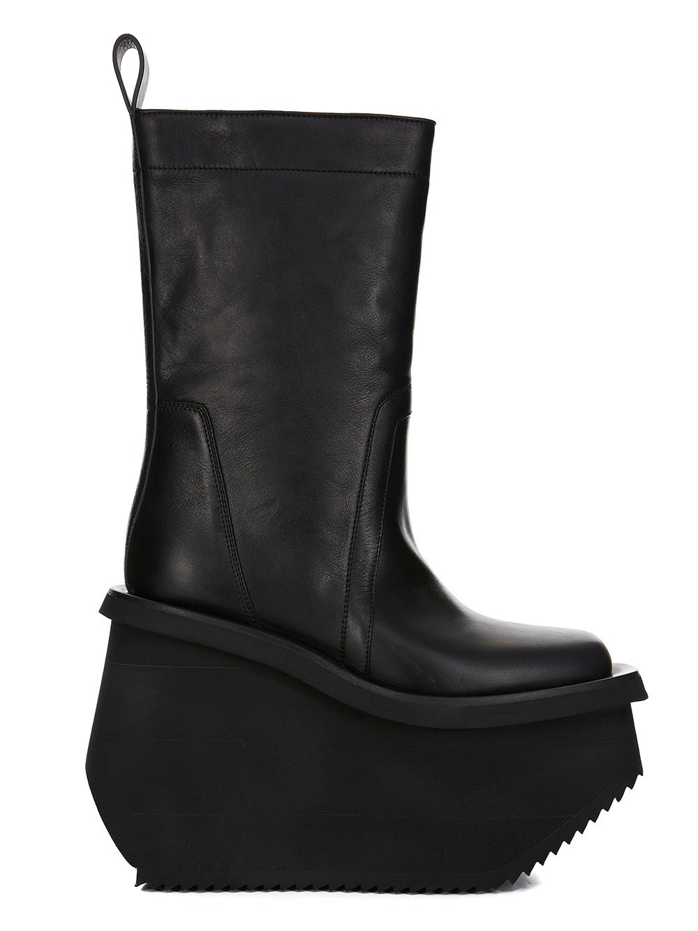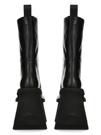 RICK OWENS FW25 CONCORDIANS RUNWAY FACTORY BOOTS IN BLACK WASHED CALF LEATHER THESE FACTORY BOOTS ARE MID-CALF HEIGHT. THEY HAVE A TOPSTITCHED SEAM ARCING OVER THE FRONT FOOT WITH STITCHING RUNNING OVER THE ANTERIOR ANKLE. THEY FEATURE AN ANGULAR HEEL COUNTER AND A BACK LOOP PULL TAB AND HAVE 14CM HIGH SHARK-TOOTH SOLE UNDERNEATH AND AT FRONT AND HAVE A SLANTING HEEL AND INCLINED TOE PLATFORM THIS HEAVYWEIGHT COW LEATHER IS VEG TANNED AND FINISHED USING NATURAL WAXES. A FINAL WASH GIVES THIS LEATHER ITS SOFTNESS AND BRINGS OUT THE NATURAL GRAIN TEXTURE OF EACH SKIN. BECAUSE THIS SKIN IS NAKED, NOT FINISHED USING ANY PIGMENTS COVERING THE SKIN, NATURAL MARKINGS AND SHADINGS ARE VISIBLE WHICH MAKES EACH SKIN AND PRODUCT UNIQUE VEG TANNING MEANS ONLY VEGETAL AND NATURAL TANNINS WERE USED IN THE PROCESS OF TANNING AND PRESERVING THIS LEATHER THIS TANNERY IS LWG CERTIFIED WITH A SILVER RATING COLOR: BLACK MATERIAL: UPPER 100% CALF LEATHER LINING 100% CALF LEATHER INSOLE 100% CALF LEATHER PLATFORM AT HEEL 14CM PLATFORM AT TOE 7CM