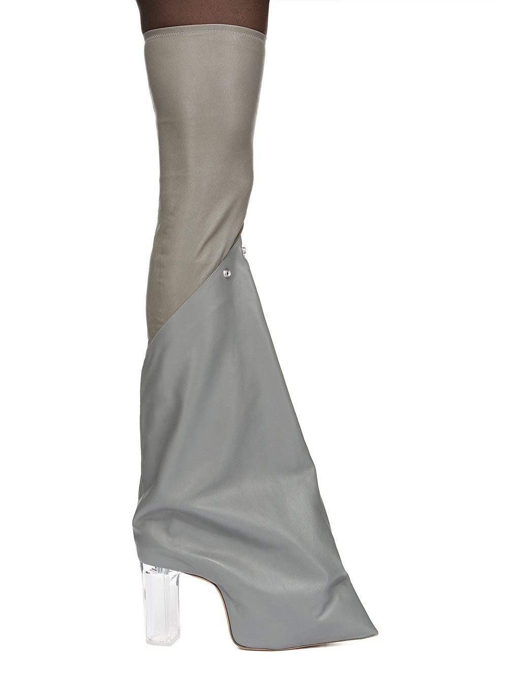 RICK OWENS FW25 CONCORDIANS RUNWAY TACO KISS IN WASHED INDIGO/CLEAR STRETCH LAMB LEATHER AND FULL GRAIN CALF LEATHER THESE TACO KISS BOOTS ARE A DEFLATED VERSION OF OUR STRAYTUKAY COLLABORATION BOOTS. THEY ARE THIGH HIGH. THEY HAVE A TIGHT SOCK UPPER, JOINING TO A DIAGONAL SEAM LINE THAT SLOPES FROM MIDPOINT, OVER THE KNEE, DOWN TO THE CENTRE BACK CALF. THEY FEATURE A LEATHER UPPER THAT FLARES DOWN THE LOWER LEG, CURVING INTO THE BACK HEEL AND POINTING AT THE TOE. INSIDE THEY HAVE A 12CM CONCEALED WEDGE (6,5CM RISE) AND A THICK FRONT PLATFORM. THIS VERSION FEATURES THREE SNAPS ON FRONT, BELOW KNEE, TO ATTACH OUR INTRICATE LEATHER CHAIN MAIL, SOLD SEPARATELY THIS IS A COMBINATION OF STRETCH LAMB LEATHER AND FULL GRAIN CALF LEATHER THIS MEDIUMWEIGHT FULL GRAIN CALF LEATHER HAS A FLAT AND MATTE SURFACE FINISH AND IS SPECIFICALLY TANNED FOR SHOES WITH AN ABRASION-RESISTANT FINISH THIS TANNERY IS LWG CERTIFIED WITH A BRONZE RATING COLOR: WASHED INDIGO/CLEAR MATERIAL: UPPER PART UPPER 65% LAMB LEATHER + 34% COTTON + 1% SPANDEX LOWER PART UPPER 100%COW LEATHER LINING 100% CALF LEATHER PLATFORM AT HEEL 12CM PLATFORM AT TOE 7,5CM RISE 4,5CM