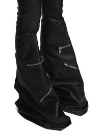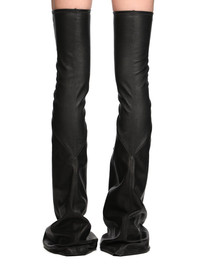 RICK OWENS FW25 CONCORDIANS CARGO FETISH SNEAKS IN BLACK/MILK STRETCH LAMB LEATHER AND WASHED CALF LEATHER THESE CARGO FETISH SNEAKS ARE ABOVE-KNEE HIGH WITH A STRETCH LEATHER TOP. THEY HAVE A BOOT SHAPED UPPER WITH AN ADDITIONAL LAYER FALLING FROM AN ASYMMETRICAL SEAM LINE, GRAZING THE FLOOR. THEY FEATURE TWO FRONT ZIPPERS, ONE HORIZONTAL AND ON ANGLED. THEY HAVE MILK TOE CAPS AND SHARK TOOTH SOLES THIS A COMBINATION OF STRETCH LAMB LEATHER AND WASHED CALF LEATHER THIS HEAVYWEIGHT LEATHER IS A HAIR-ON COWHIDE WITH NATURAL LENGTH COARSE HAIR THIS LEATHER IS TANNED IN THE VENETO AREA OF ITALY BY A TANNERY SPECIALIZED IN HAIR-ON COW LEATHER. BECAUSE THE HAIR IS NATURAL THERE CAN BE INCONSISTENCY IN THE LENGTH DIRECTION, TEXTURE AND COLOR FOR COLOR MILK 11: THIS COLOR IS ACHIEVED BY BLEACHING THE NATURAL COW HAIR. VARIATIONS IN COLOR AND ESPECIALLY YELLOW SHADINGS CAN BE PRESENT DUE TO NATURAL URINE STAINS. THIS MEANS NO TWO PRODUCTS ARE EXACTLY ALIKE, GIVING EACH ITS INDIVIDUAL UNIQUENESS. THIS NOT TO BE CONSIDER DEFECT BUT IS THE VISUAL ASPECTS DESIRED SPECIFICALLY BY RICK OWENS THIS TANNERY IS LWG CERTIFIED WITH A SILVER RATING COLOR: BLACK/MILK MATERIAL: UPPER PART UPPER 65% LAMB LEATHER + 34% COTTON + 1% SPANDEX LOWER PART UPPER 100% CALF LEATHER LINING 100% CALF LEATHER INSOLE 100% CALF LEATHER SOLE 100% THERMOPLASTIC RUBBER SOLE HEIGHT 3.5CM