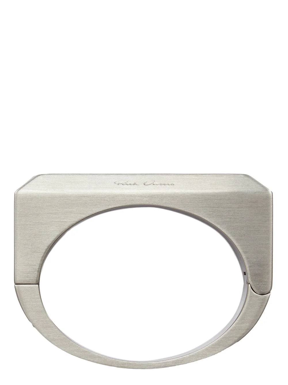 RICK OWENS BEVELED BANGLE IN ALUMINIUM THIS BEVELED BANGLE IS A SOLID METAL CUFF WITH BEVELED EDGES. IT HAS A MAGNETIC CLASP SIDE CLOSURE AND THE RICK OWENS LOGO ENGRAVED IN THE SIDE FACE. THIS JEWLERY PIECE HAS A SEMI-SHINY BRUSHED PALLADIUM FINISH. - COLOR: PALLADIO - MATERIAL: 100% TIN - AVAILABLE IN ONE SIZE WITH AN INSIDE DIAMETER OF 6,4CM