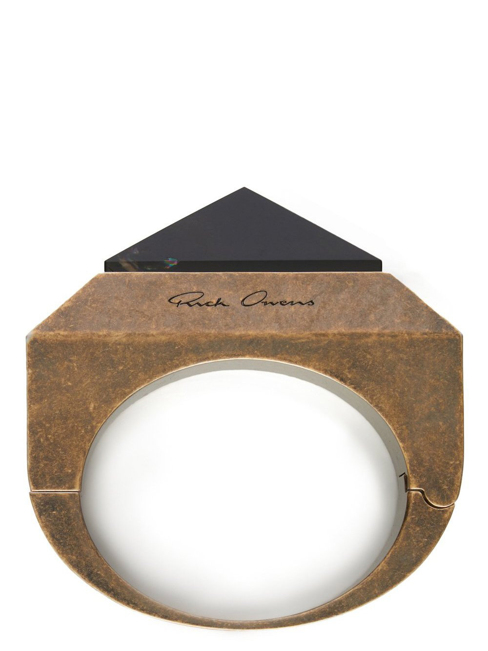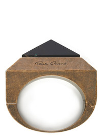 RICK OWENS CRYSTAL PYRAMID BANGLE IN ALUMINIUM AND SMOKEY QUARTZ THIS CRYSTAL PYRAMID BANGLE IS A SOLID METAL CUFF WITH BEVELED EDGES ORNAMENTED WITH A LARGE PYRAMID SHAPED ROCK CRYSTAL STONE. IT HAS A MAGNETIC CLASP SIDE CLOSURE AND THE RICK OWENS LOGO ENGRAVED IN THE SIDE FACE THIS JEWELRY PIECE IS MADE USING GENUINE SMOKEY QUARTZ CRYSTAL STONES AND HAS A MATTE DARK BRONZE FINISH THIS FINISH IS OBTAINED BY DARKENING A BRONZE COLOR GALVANIZATION, THE RESULT IS IRREGULAR MEANING EACH PIECE HAVE ITS OWN UNIQUE SHADINGS. THE SMOKEY QUARTZ CRYSTAL STONES USED IN THIS PIECE ARE NATURAL, THEREFORE VARIATIONS IN VEIN STRUCTURE AND COLORATION ARE NOT IMPERFECTIONS OR DEFECTS BUT INHERENT CHARACTERISTICS OF THIS MATERIAL AND WHAT MAKES EACH PIECE UNIQUE - COLOR: DARK BRONZE - MATERIAL: ALUMINIUM AND SMOKEY QUARTZ