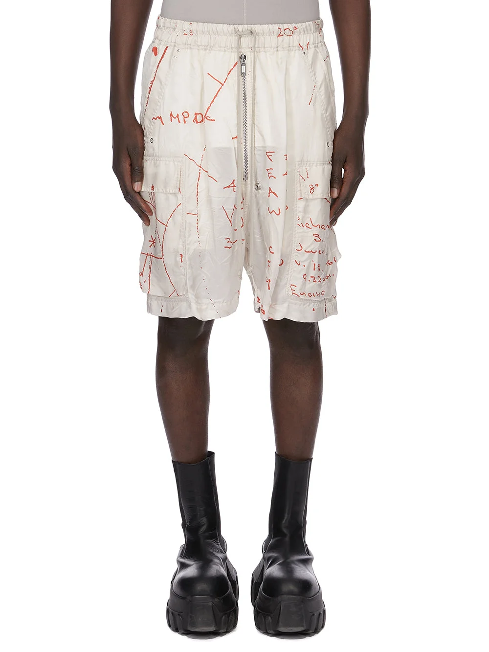 RICK OWENS SS26 TEMPLE CARGOBELA SHORTS IN MILK/ORANGE PRINTED CUPRO TWILL THESE CARGOBELA SHORTS ARE KNEE-LENGTH, WITH A LOW CROTCH AND WIDE LEG. THEY FEATURE AN ELASTICIZED WAISTBAND WITH DRAWSTRING AND A BELA EXPOSED CENTER ZIPPER WITH TWO SNAP DETAIL, AT BOTTOM. THEY FEATURE TWO BEVELED CARGO POCKETS ON THE SIDE LEG WITH TWO REAR WELT POCKETS, ALL WITH CONCEALED SNAPS AND TOPSTITCHING. THIS SHORTS FEATURES AN EXACT COPY OF RICK OWENS’ ASTROLOGICAL NATAL CHART, HAND-DRAWN BY HIS FATHER JOHN ON THE DAY OF HIS BIRTH IN 1961. THIS LIGHTWEIGHT AND FLUID CUPRO TWILL HAS A GLOSSY SURFACE, A SOFT HANDFEEL AND WASHED FINISH. IT IS DIGITALLY PRINTED WITH OUR SEASONAL ASTRO MOTIF. THIS FABRIC IS MADE USING CERTIFIED CUPRO WHICH IS BIODEGRADABLE AND 100% PLANT BASED. AS IT’S MADE FROM COTTON WASTE, CUPRO HELPS FIND A PURPOSE TO FIBERS THAT WOULD OTHERWISE BE DISCARDED. COLOR: MILK/ORANGE MATERIAL:52% VISCOSE + 48% CUPRO MODEL IS 189CM TALL MODEL WEARS SIZE 48