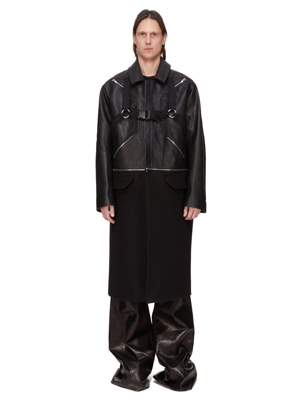 RICK OWENS FW25 CONCORDIANS RUNWAY BLIXA JUMBO MAC IN BLACK WASHED CALF LEATHER AND MELTON THIS BLIXA JUMBO MAC IS BELOW KNEE LENGTH WITH LONG SLEEVES AND A SQUARE FIT. IT HAS A CLASSIC COLLAR AND A CENTRE ZIPPER OPENING, BLIXA TWO-WAY ZIPPERED CHEST POCKETS AND TWO LOWER FLAP POCKETS ON FRONT AS WELL AS THE HARNESS DETAIL ON FRONT CHEST. IT FEATURES THE IT FEATURES A ZIP HEM, ALLOWING PIECES TO BE CONVERTED INTO LONGER OR SHORTER GARMENTS. THIS BLIXA JUMBO MAC IS COAT LENGTH BUT CAN BE UNZIPPED INTO A CROPPED PIECE. THE ZIPS CAN ALSO BE PARTIALLY UNDONE, ALLOWING THE BOTTOM HALF TO DRAPE BEHIND. IT HAS A CENTRE BACK VENT. IT IS FULLY LINED WITH TWO INTERNAL ZIPPERED POCKETS. THIS VERSION HAS CONTRAST LEATHER TOP AND VIRGIN WOOL LOWER HALF THIS IS A COMBINATION OF WASHED CALF LEATHER AND MELTON THIS HEAVYWEIGHT COW LEATHER IS VEG TANNED AND FINISHED USING NATURAL WAXES. A FINAL WASH GIVES THIS LEATHER ITS SOFTNESS AND BRINGS OUT THE NATURAL GRAIN TEXTURE OF EACH SKIN. BECAUSE THIS SKIN IS NAKED, NOT FINISHED USING ANY PIGMENTS COVERING THE SKIN, NATURAL MARKINGS AND SHADINGS ARE VISIBLE WHICH MAKES EACH SKIN AND PRODUCT UNIQUE VEG TANNING MEANS ONLY VEGETAL AND NATURAL TANNINS WERE USED IN THE PROCESS OF TANNING AND PRESERVING THIS LEATHER THIS TANNERY IS LWG CERTIFIED WITH A SILVER RATING COLOR: BLACK MATERIAL: UPPER BODY AND SLEEVES 100% CALF LEATHERLOWER BODY 100% NEW WOOL BODY AND POCKETS LINING 100% COTTON MODEL IS 189CM TALL MODEL WEARS SIZE 46