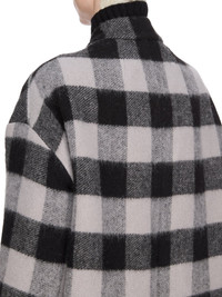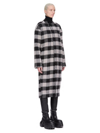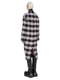 RICK OWENS FW25 CONCORDIANS ISLAND COAT IN BLACK JUMBO PLAID THIS ISLAND COAT IS CALF LENGTH WITH LONG SLEEVES. IT HAS A SHAWL COLLAR WITH A SQUARE NECK AND LEVEL SHOULDER SEAMS. IT HAS A FRONT WRAP WITH CONCEALED SNAPS, A SIDE SEAM POCKETS. IT TAPERS TO THE HEM AND HAS A TRIANGULAR BACK SPLIT THIS HEAVYWEIGHT JUMBO PLAID WOOL FABRIC IS WOVEN IN A SQUARE PATTERN AND FINISHED IN MULTIPLE STEPS INCLUDING TUMBLING AND BRUSHING TO ACHIEVE ITS FINAL SOFTNESS AND TEXTURE THIS FABRIC IS MADE FROM RWS CERTIFIED VIRGIN WOOL WHICH ENSURES A HIGH STANDARD IN ANIMAL WELFARE, ENVIRONMENTAL SUSTAINABILITY AND SOCIAL RESPONSIBILITY. EACH BALE OF WOOL IS TRACEABLE BACK TO ITS SOURCE COLOR: BLACK PLAID MATERIAL: 100% NEW WOOL POCKETS LINING 100% COTTON MODEL IS 181CM TALL MODEL WEARS SIZE 40