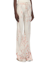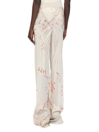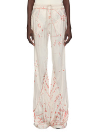 RICK OWENS SS26 TEMPLE DRAWSTRING BIAS IN MILK/ORANGE PRINTED CUPRO TWILL THESE DRAWSTRING BIAS PANTS ARE FLOOR-LENGTH WITH A LOOSE FIT. THEY ARE BIAS CUT WITH DIAGONAL SEAMS TRACING AROUND THE LEGS. THEY HAVE SQUARE SIDE POCKETS, AN ELASTICIZED, RIBBED WAISTBAND WITH DRAWSTRING AND RAW CUT HEMS. THIS LIGHTWEIGHT AND FLUID CUPRO TWILL HAS A GLOSSY SURFACE, A SOFT HANDFEEL AND WASHED FINISH. IT IS DIGITALLY PRINTED WITH OUR SEASONAL ASTRO MOTIF. THIS FABRIC IS MADE USING CERTIFIED CUPRO WHICH IS BIODEGRADABLE AND 100% PLANT BASED. AS IT’S MADE FROM COTTON WASTE, CUPRO HELPS FIND A PURPOSE TO FIBERS THAT WOULD OTHERWISE BE DISCARDED. COLOR: MILK/ORANGE MATERIAL:52% VISCOSE + 48% CUPRO MODEL IS 181CM TALL MODEL WEARS SIZE 40