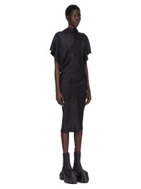 RICK OWENS FW25 CONCORDIANS SEB DRESS IN BLACK WASHED CUPRO THIS SEB DRESS IS KNEE-LENGTH, WITH A DRAPED BIAS CUT BODY, SHORT WIDE KIMONO SLEEVES AND A HIGH DRAPED COWL NECK THAT HAS AN ASYMMETRICAL OPENING AT BACK THIS MEDIUMWEIGHT WASHED CUPRO SATIN IS FLUID AND FINISHED WITH ENZYMES WHICH GIVES THIS FABRIC ITS PEACH HANDFEEL THIS FABRIC IS MADE USING CUPRO WHICH IS BIODEGRADABLE AND 100% PLANT BASED. AS IT’S MADE FROM COTTON WASTE, CUPRO HELPS FIND A PURPOSE TO FIBERS THAT WOULD OTHERWISE BE DISCARDED COLOR: BLACK MATERIAL: 100% CUPRO MODEL IS 181CM TALL MODEL WEARS SIZE 40