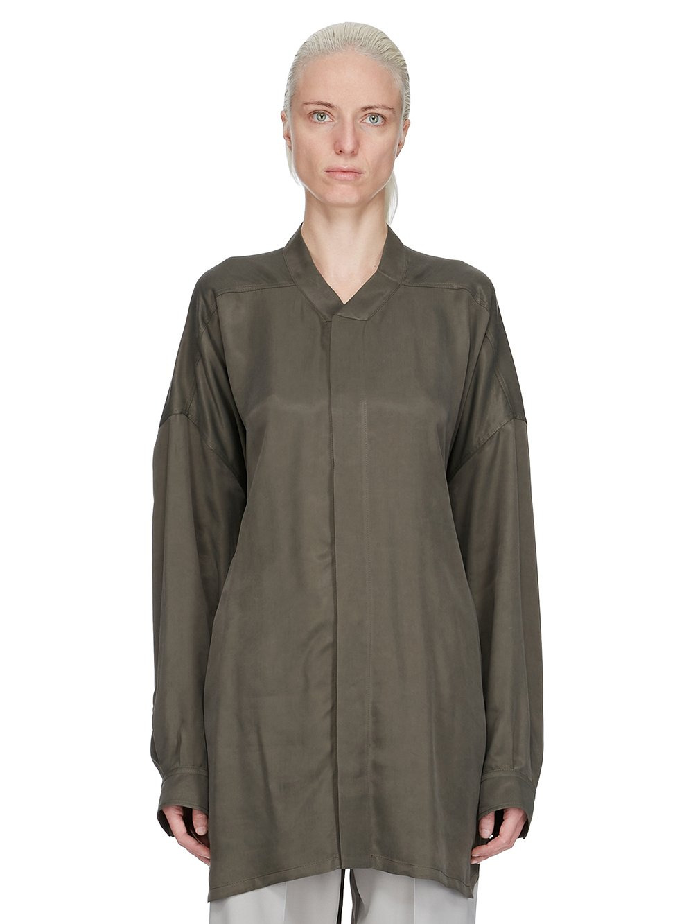 RICK OWENS FW25 CONCORDIANS JUMBO FAUN MINI IN BOSCO WASHED CUPRO THIS JUMBO FAUN MINI IS BELOW-HIP LENGTH WITH LONG SLEEVES AND AN OVERSIZED. IT HAS A CENTRE FRONT OPENING WITH CONCEALED SNAP CLOSURES, A SLIGHT V NECK WITH FLAT COLLAR, AND SNAP CUFFS. IT FEATURES LEVEL SHOULDER SEAMS, BACK YOKE AND A HEMLINE WITH BEVELED SIDES THIS MEDIUMWEIGHT WASHED CUPRO SATIN IS FLUID AND FINISHED WITH ENZYMES WHICH GIVES THIS FABRIC ITS PEACH HANDFEEL THIS FABRIC IS MADE USING CUPRO WHICH IS BIODEGRADABLE AND 100% PLANT BASED. AS IT’S MADE FROM COTTON WASTE, CUPRO HELPS FIND A PURPOSE TO FIBERS THAT WOULD OTHERWISE BE DISCARDED COLOR: BOSCO MATERIAL: 100% CUPRO MODEL IS 181CM TALL MODEL WEARS SIZE 40